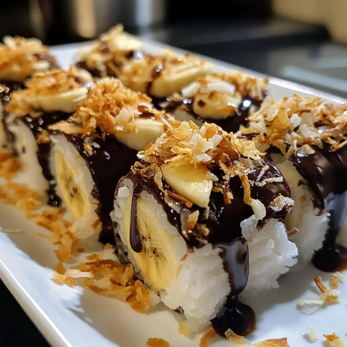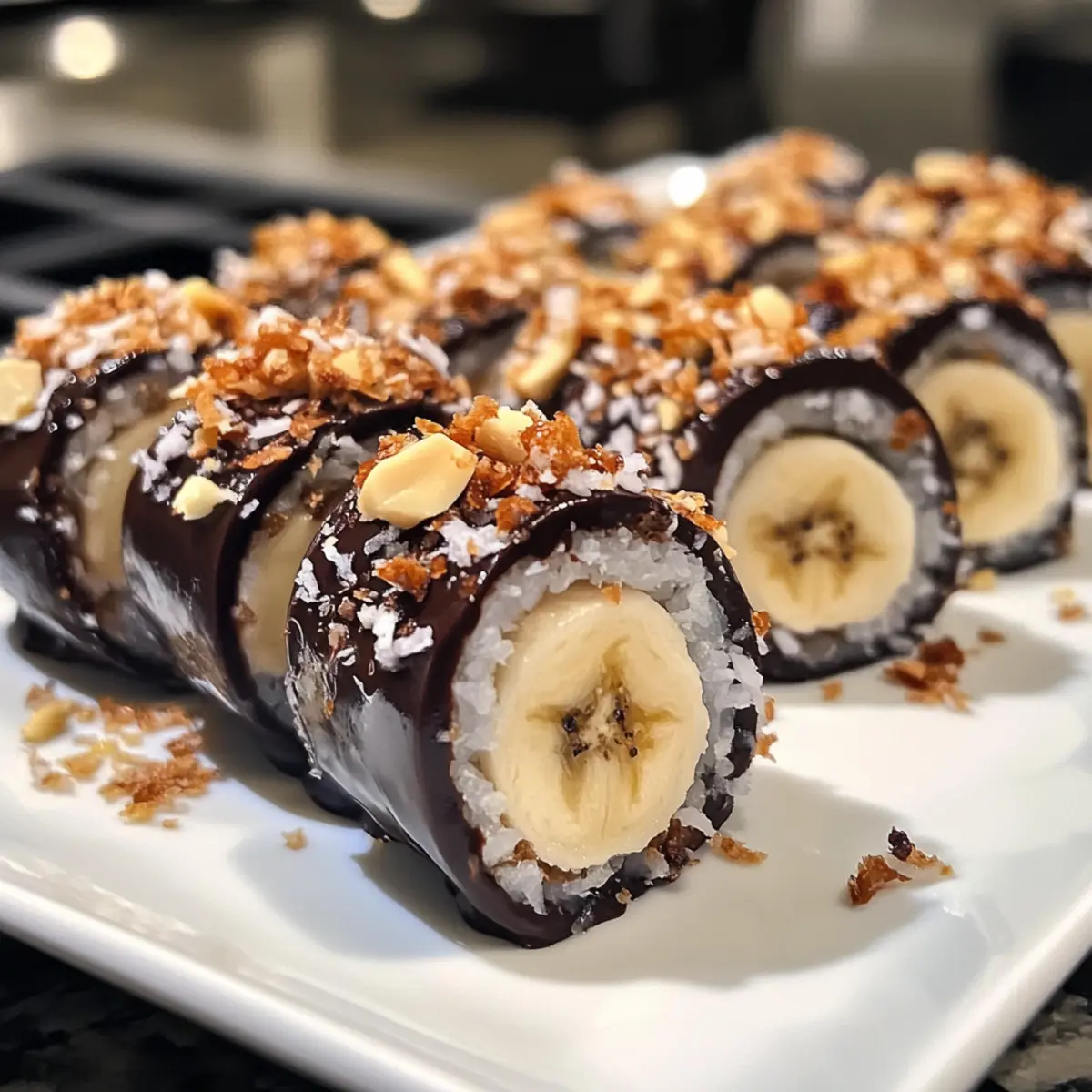 Sie können bunte Streusel oder zusätzliche Nüsse ausreichend über die Schokoladenschicht streuen, um Ihr Bananen Sushi optisch aufzuwerten. Servieren Sie die Rollen auf einem hübschen Teller und verwenden Sie Essstäbchen für ein spaßiges, interaktives Erlebnis!