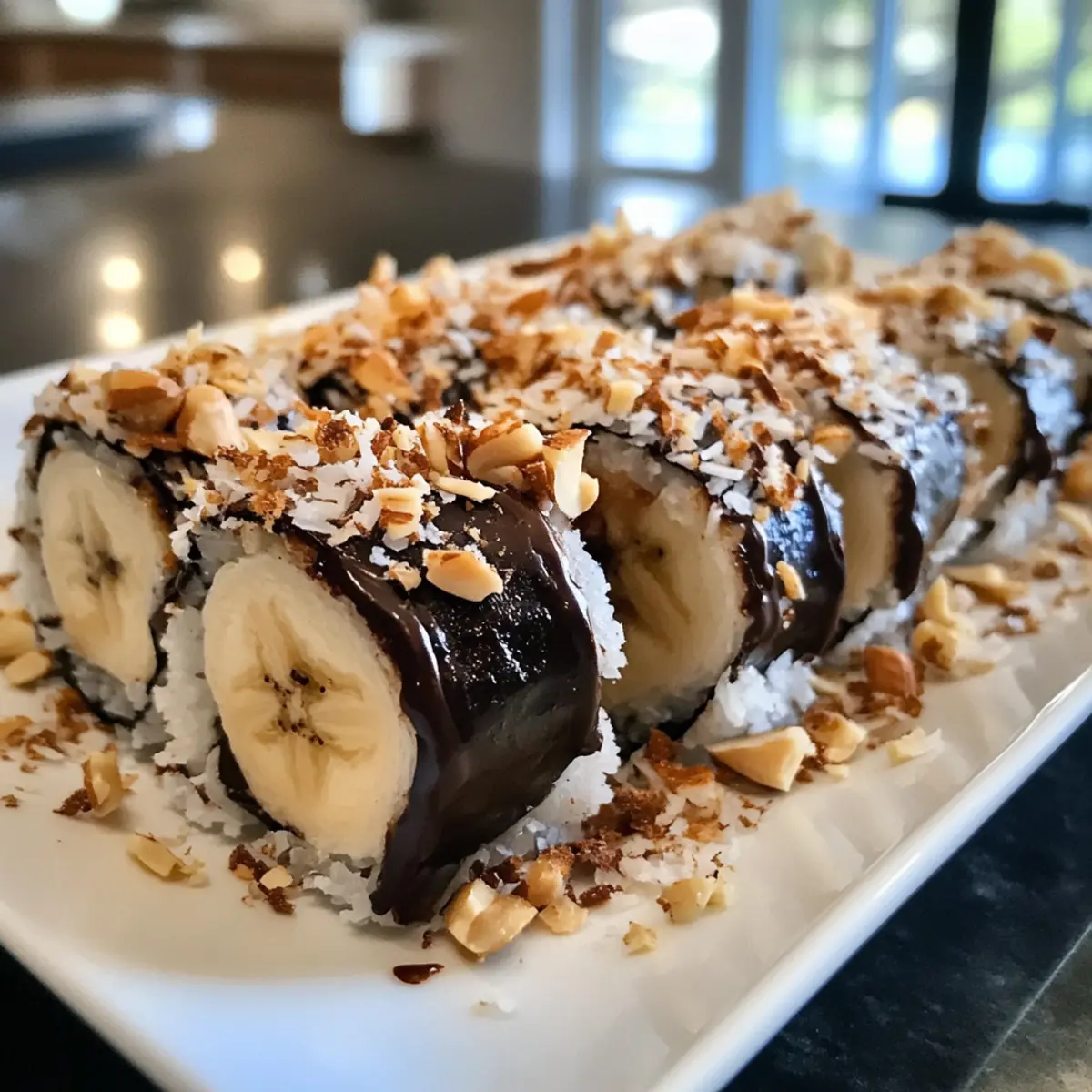 Roll die schokoladenbedeckten Bananen sofort in der vorbereiteten Kokos-Nuss-Mischung, bis sie vollständig umhüllt sind. Die Kombination von Kokos und Nüssen sorgt für eine köstliche Textur, die den Geschmack der Bananen “Sushi” ergänzt. Legen Sie die Bananen anschließend flach auf einen Teller oder ein Holzbrett.
