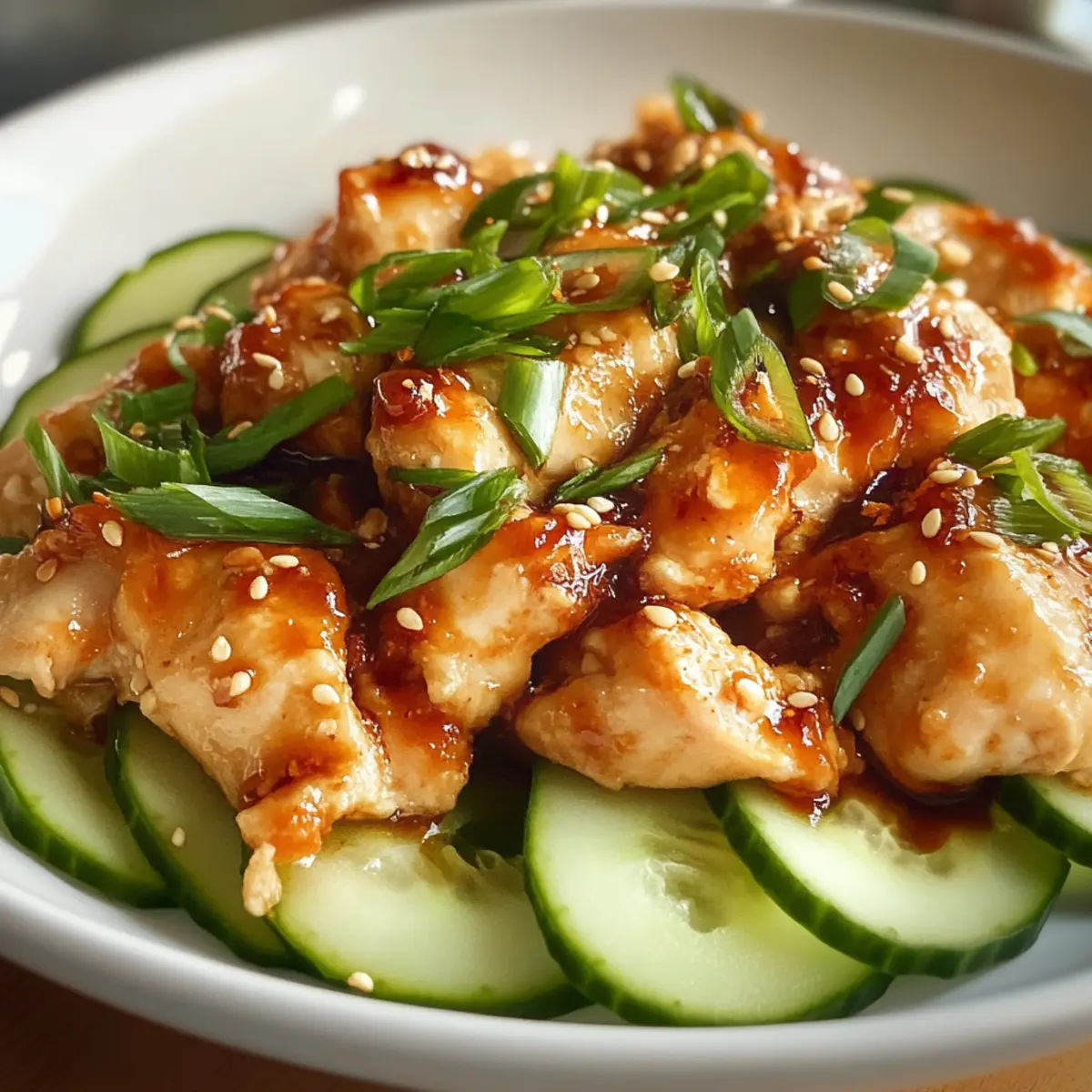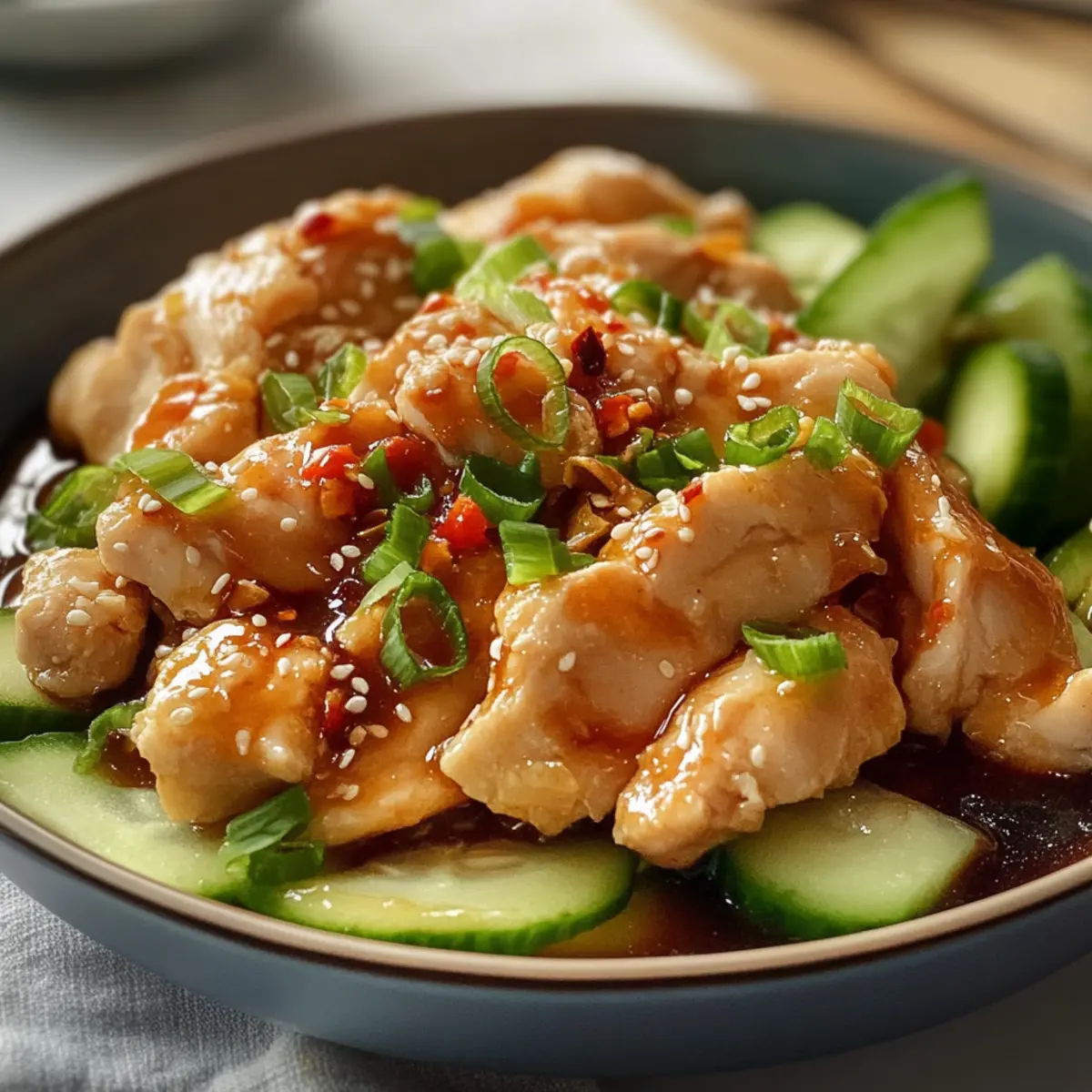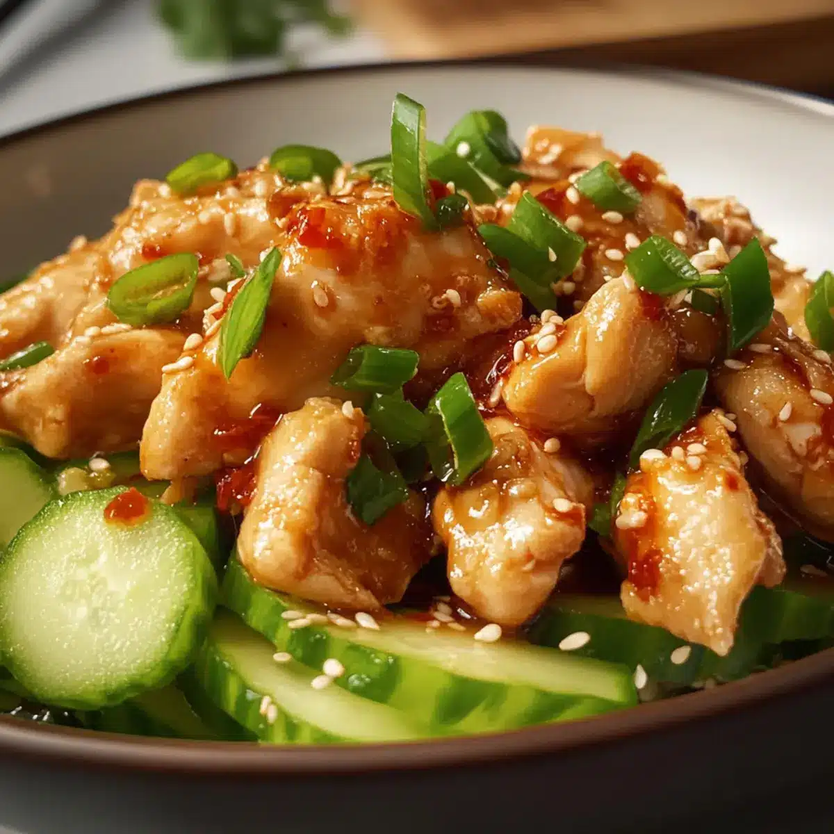 Frische Aromen: Zartes Hühnchen wird durch die knackige Gurke und die würzige Sesam-Chili-Sauce perfekt ergänzt.