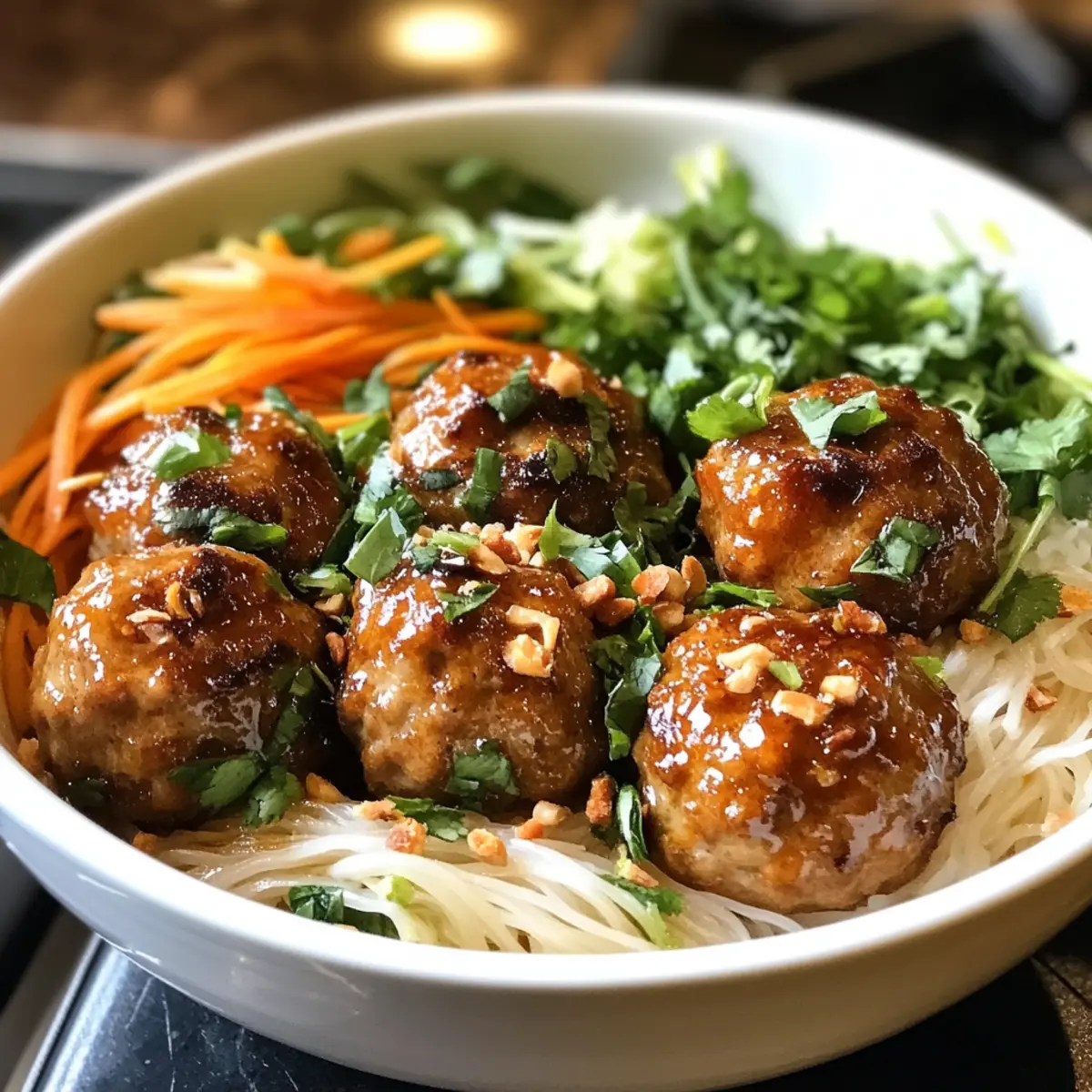 - Die gekochten Vermicelli-Nudeln auf Schalen verteilen, Fleischbällchen und Gemüse hinzufügen und mit der Nuoc Cham Sauce beträufeln.