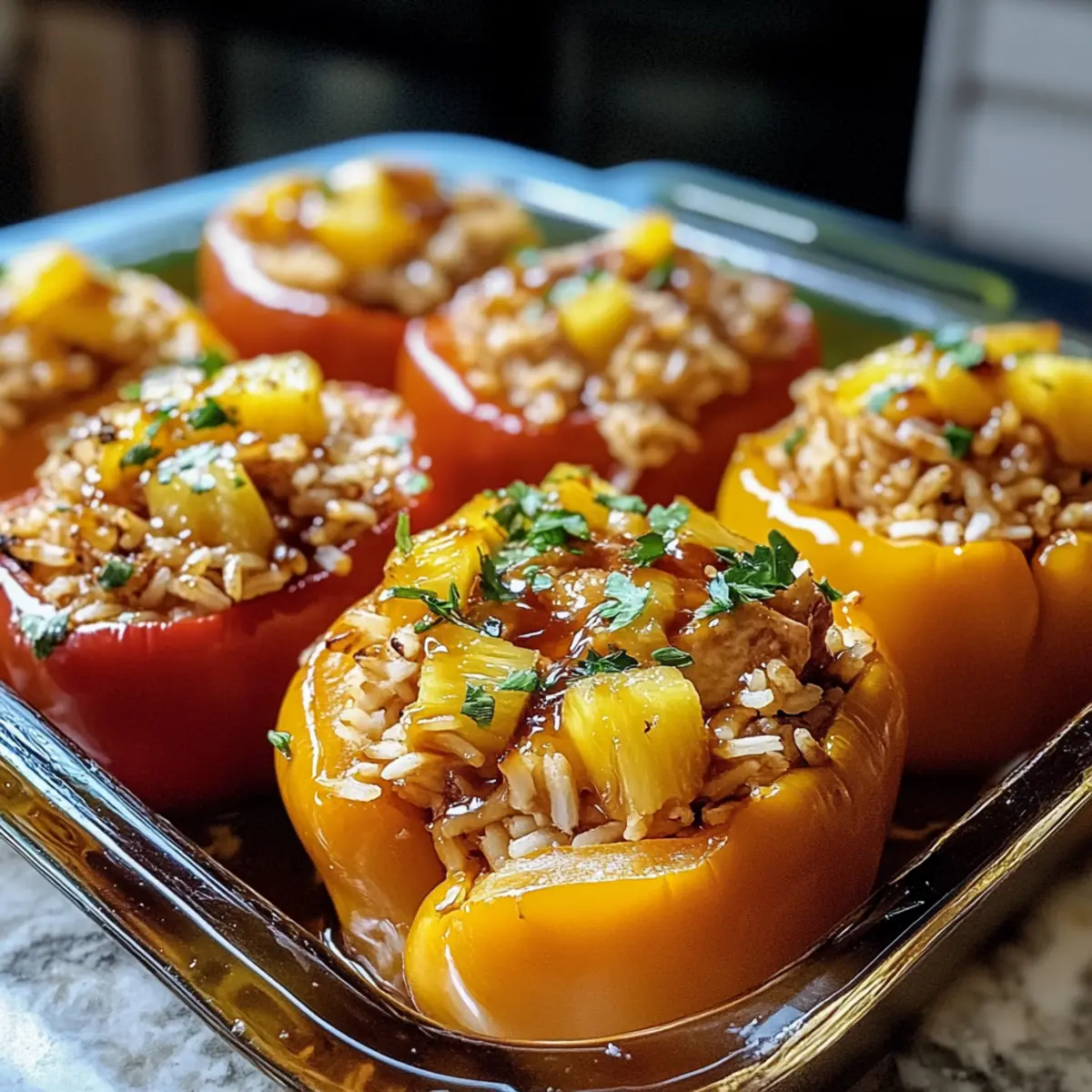 Teriyaki-Ananas-Hühnchen und Reis gefüllt in Paprika