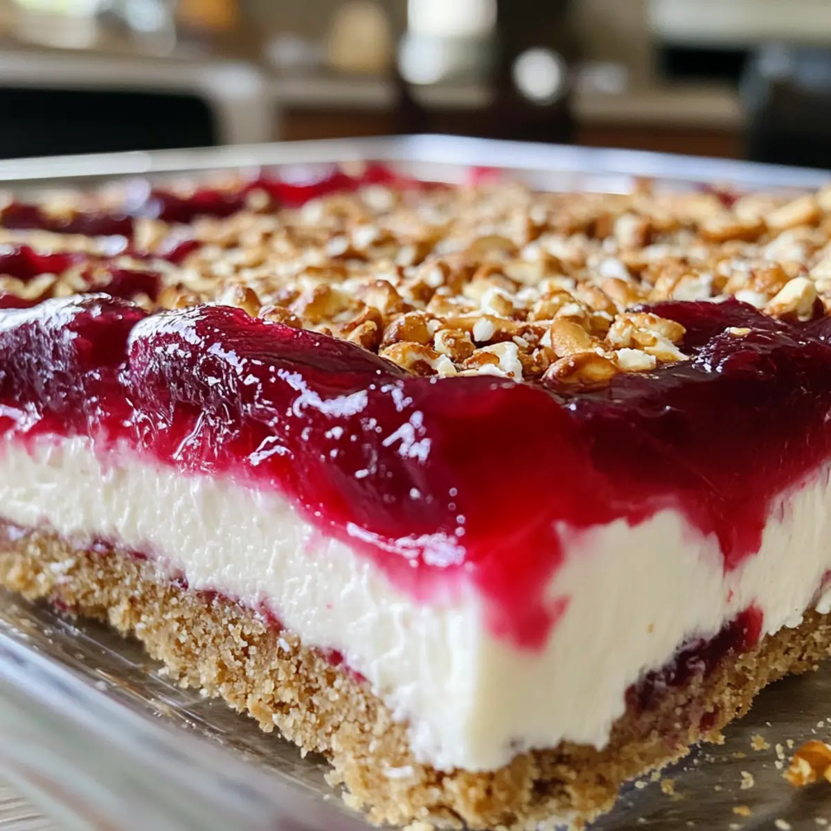 Wenn der Brezelboden zu weich wird, könnte er nicht fest werden. Um dies zu verhindern, drücke die Pretzelmasse fest in die Backform und achte darauf, dass sie komplett abgekühlt ist, bevor du die Füllung hinzufügst. Falls die Gelée-Schicht nicht gut fest wird, könnte es an zu warmem Jello liegen; stelle sicher, dass es nur leicht geliert ist, bevor du es über die Füllung gießt.
