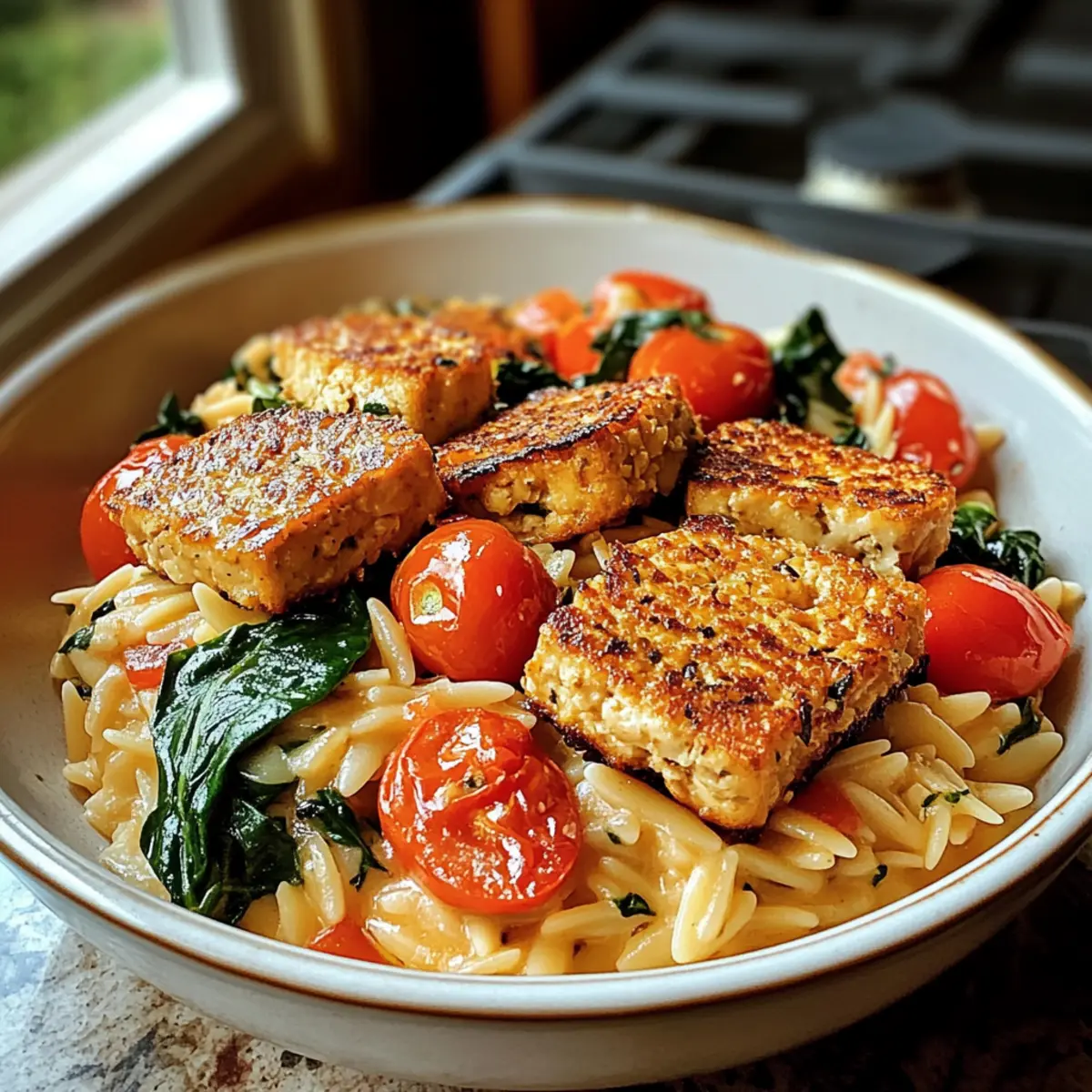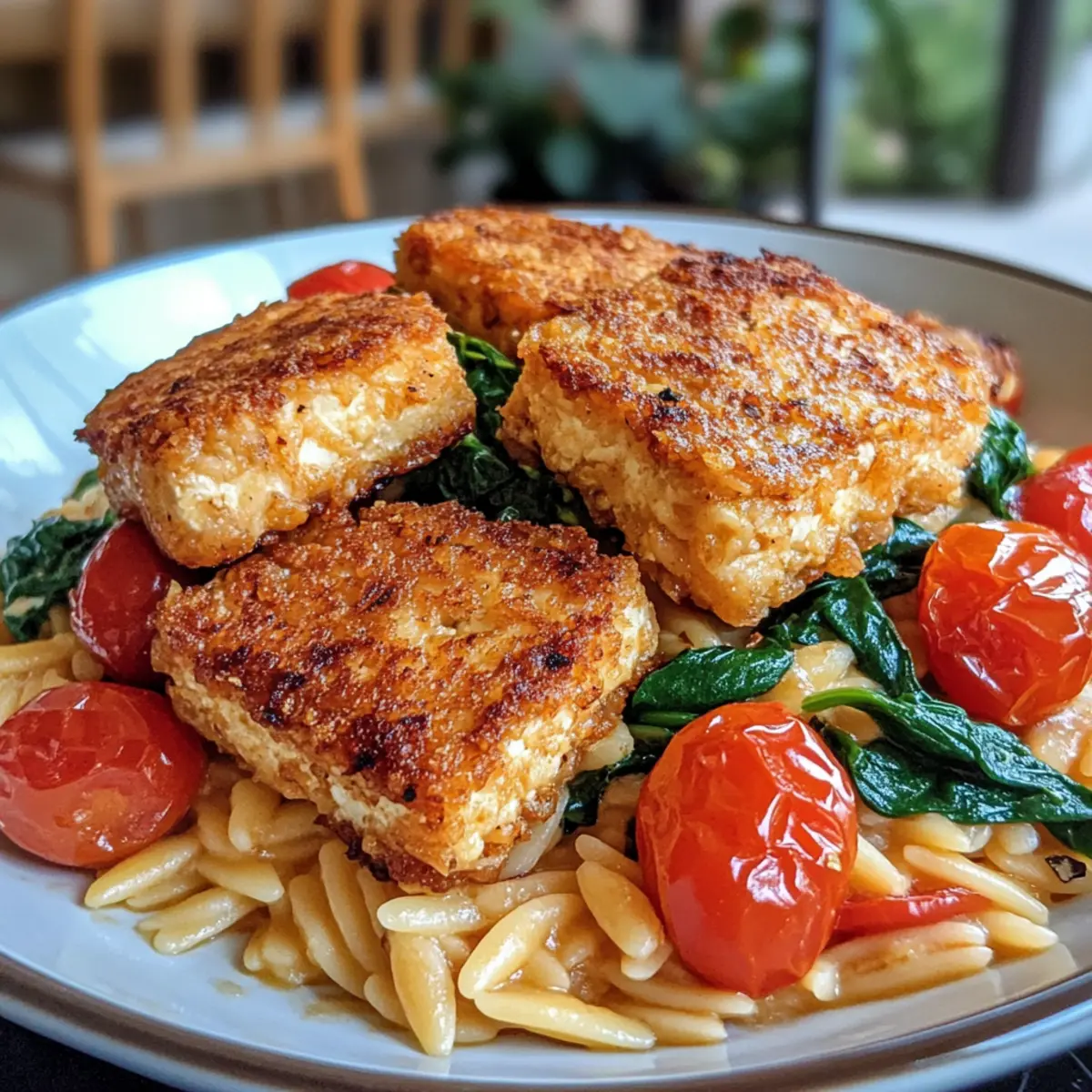 Cremige Tomaten-Orzo mit knusprigen Tofu-Schnitzeln