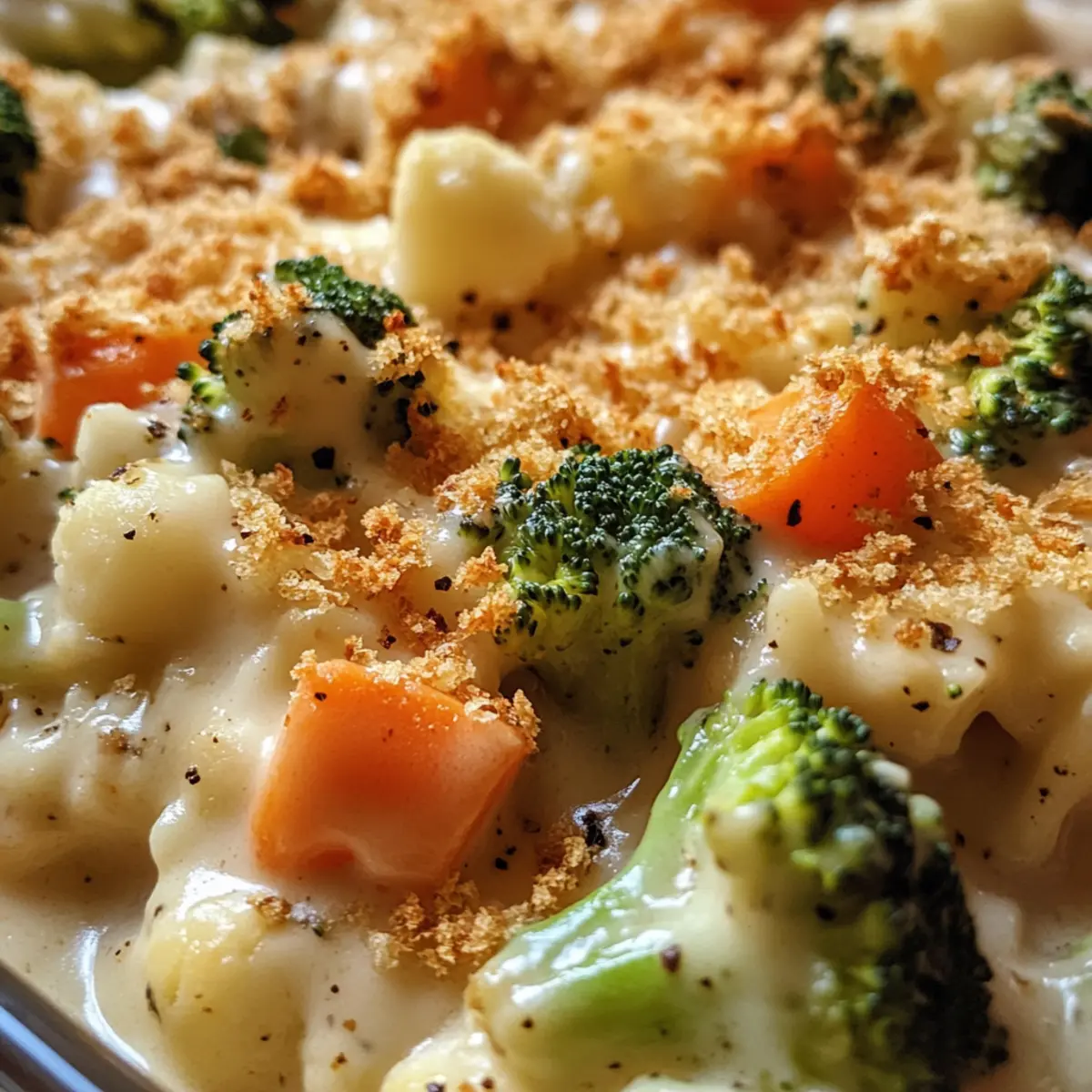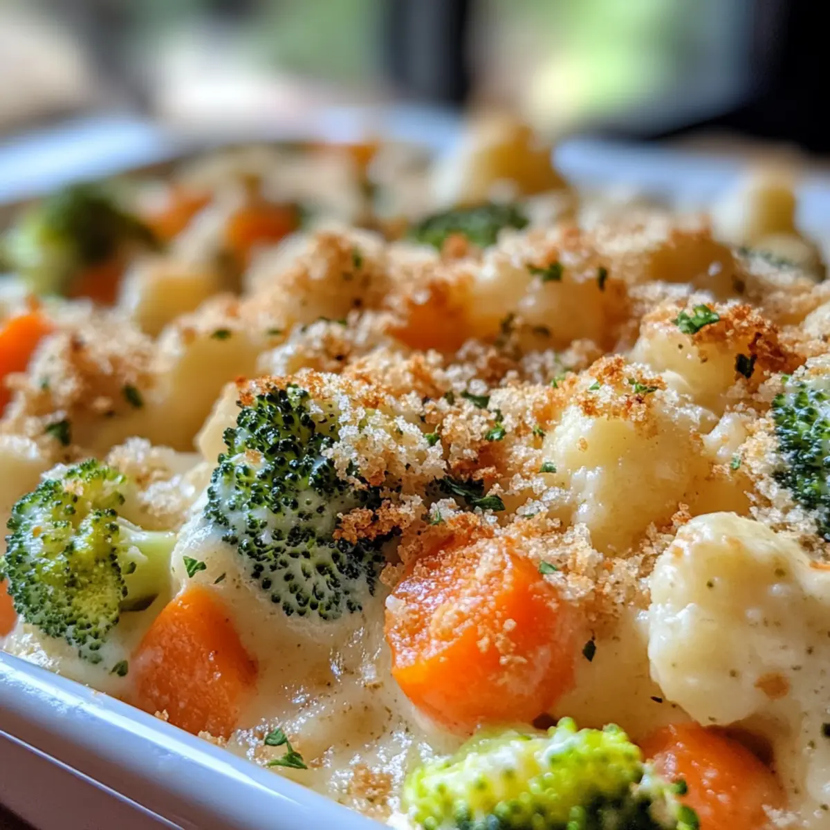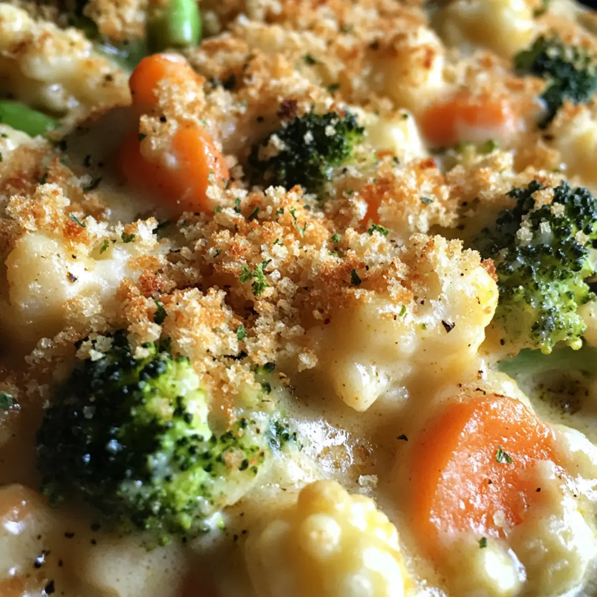 Mische 1 Tasse Semmelbrösel mit 1/4 Tasse geriebenem Parmesan in einer kleinen Schüssel. Streue diese Mischung gleichmäßig über den cremigen Gemüseauflauf, um eine knusprige Kruste zu erzeugen, die beim Backen goldbraun wird.