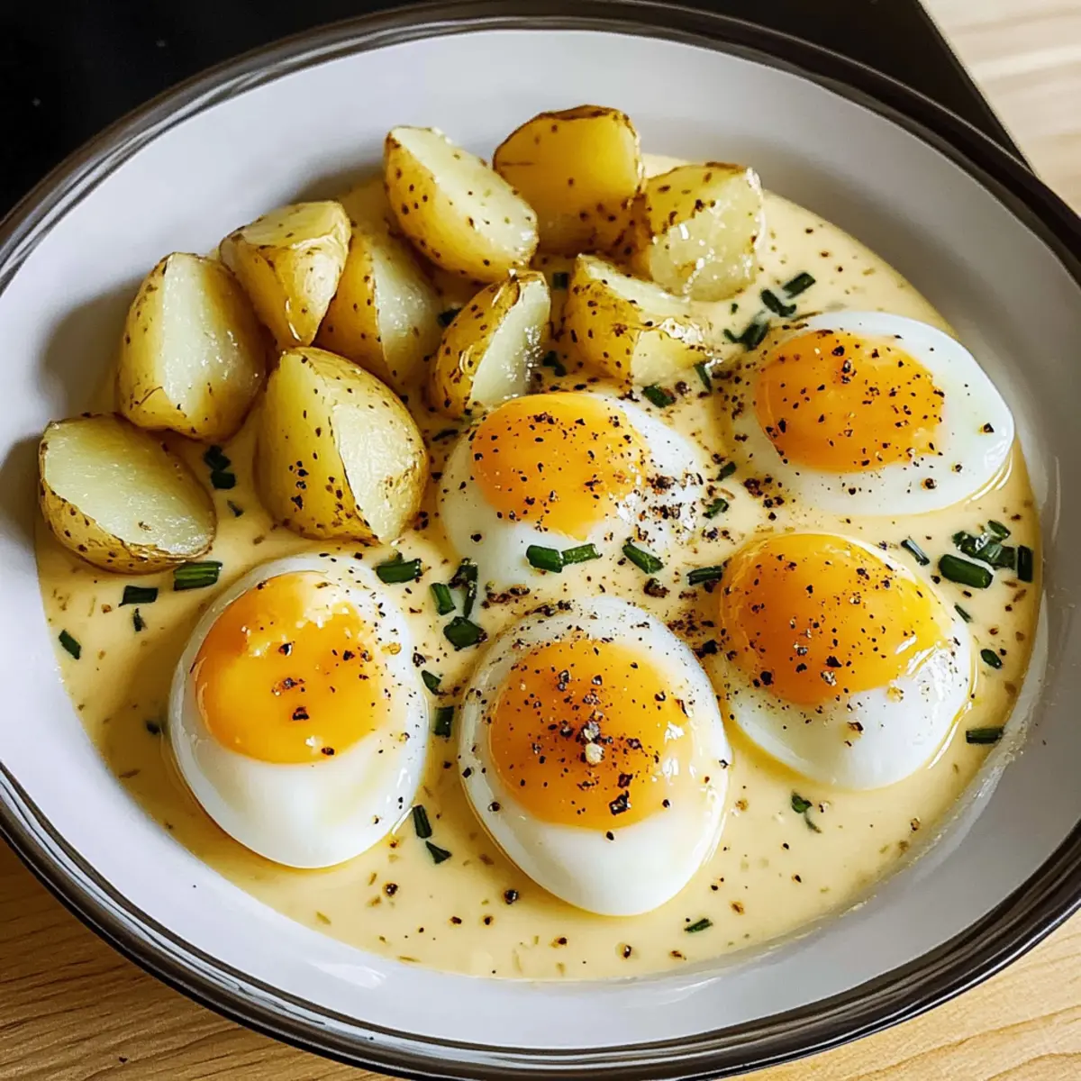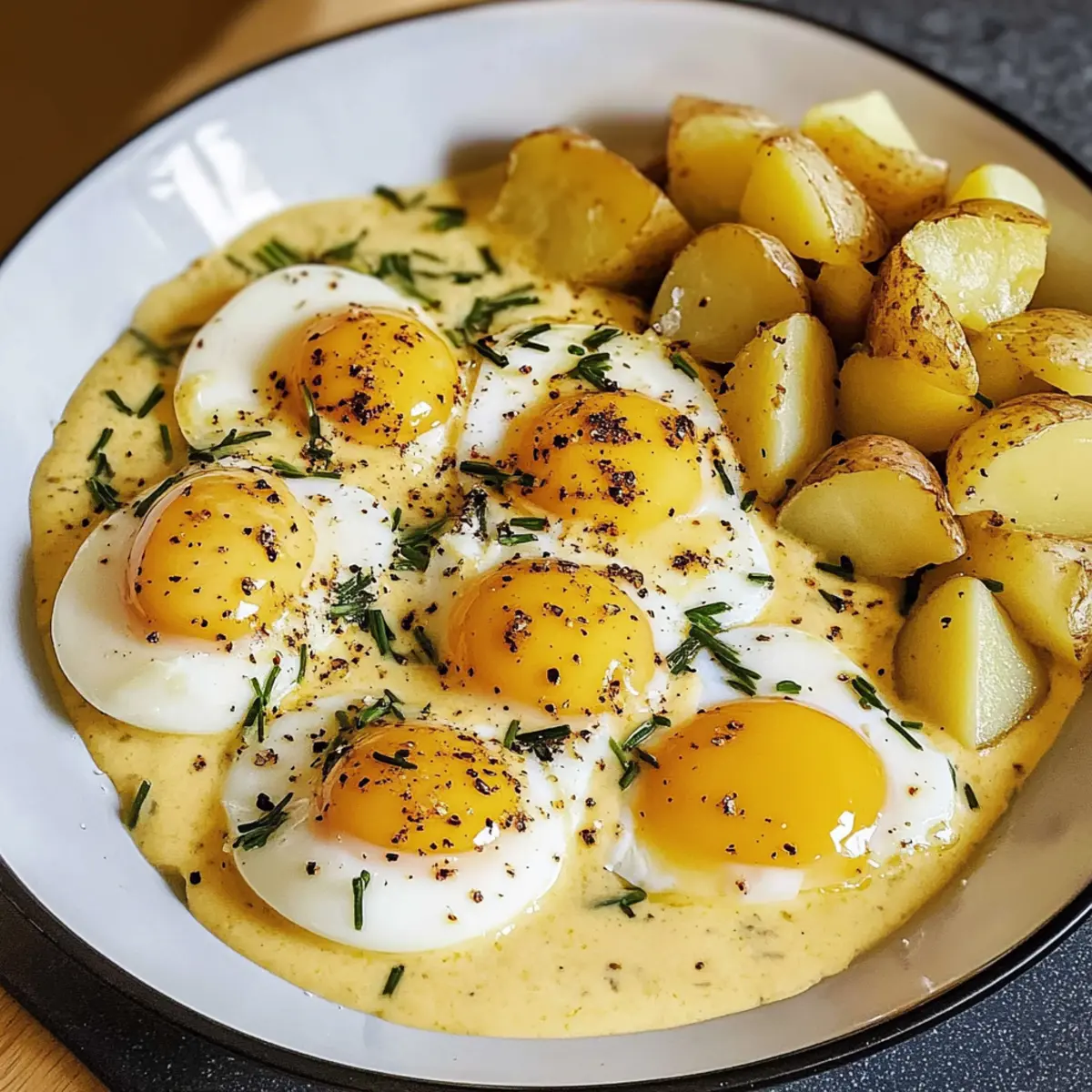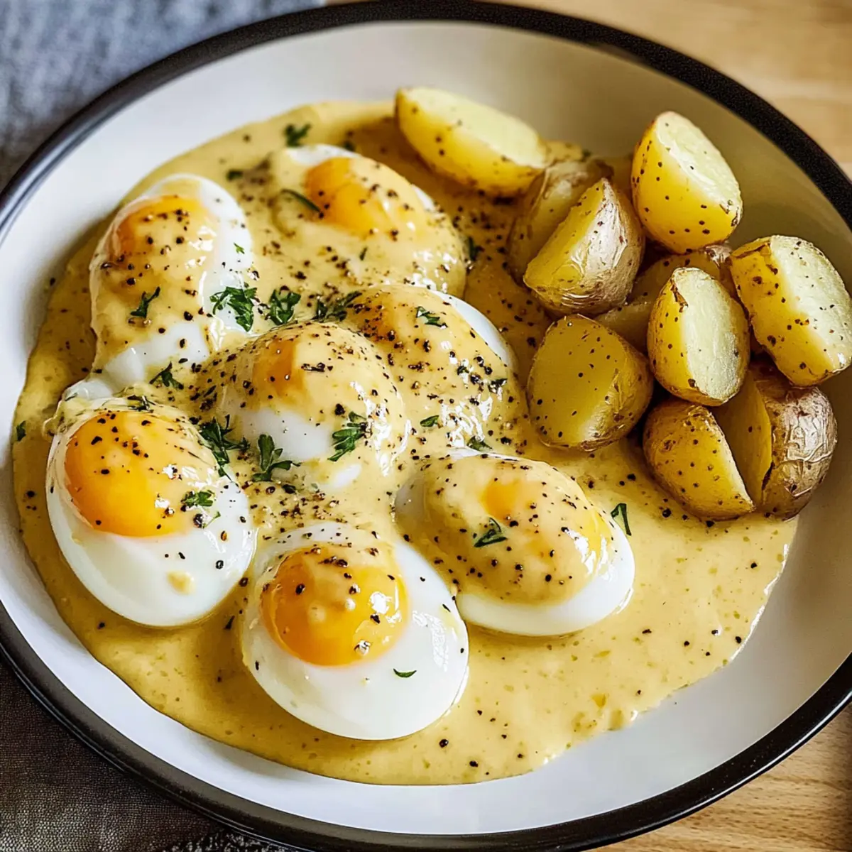 Cremiger Kartoffelbrei ergänzt die zarten Eier und nimmt die köstliche Senfsoße wunderbar auf. Jeder Löffel sorgt für eine perfekte Geschmackskomposition. -