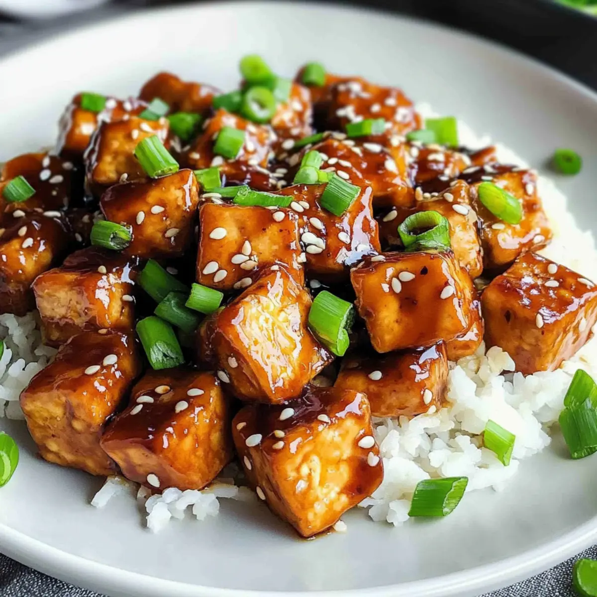 - Servieren: Serviere den Tofu über Reis oder Quinoa und garniere mit Sesam und Frühlingszwiebeln.