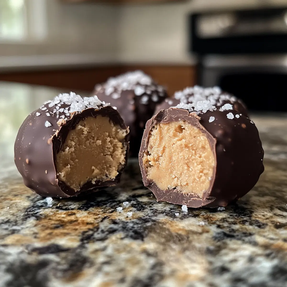 Sobald alle Bissen in Schokolade getaucht sind, bestreue sie unmittelbar mit flakigem Meersalz für einen köstlichen Kontrast zur Süße der Schokolade. Dieser Schritt ist wichtig, um den Geschmack der Erdnussbutter Joghurt Bissen zu intensivieren. Danach kannst du sie für weitere 30 Minuten in das Gefrierfach zurücklegen, damit die Schokolade fest wird.