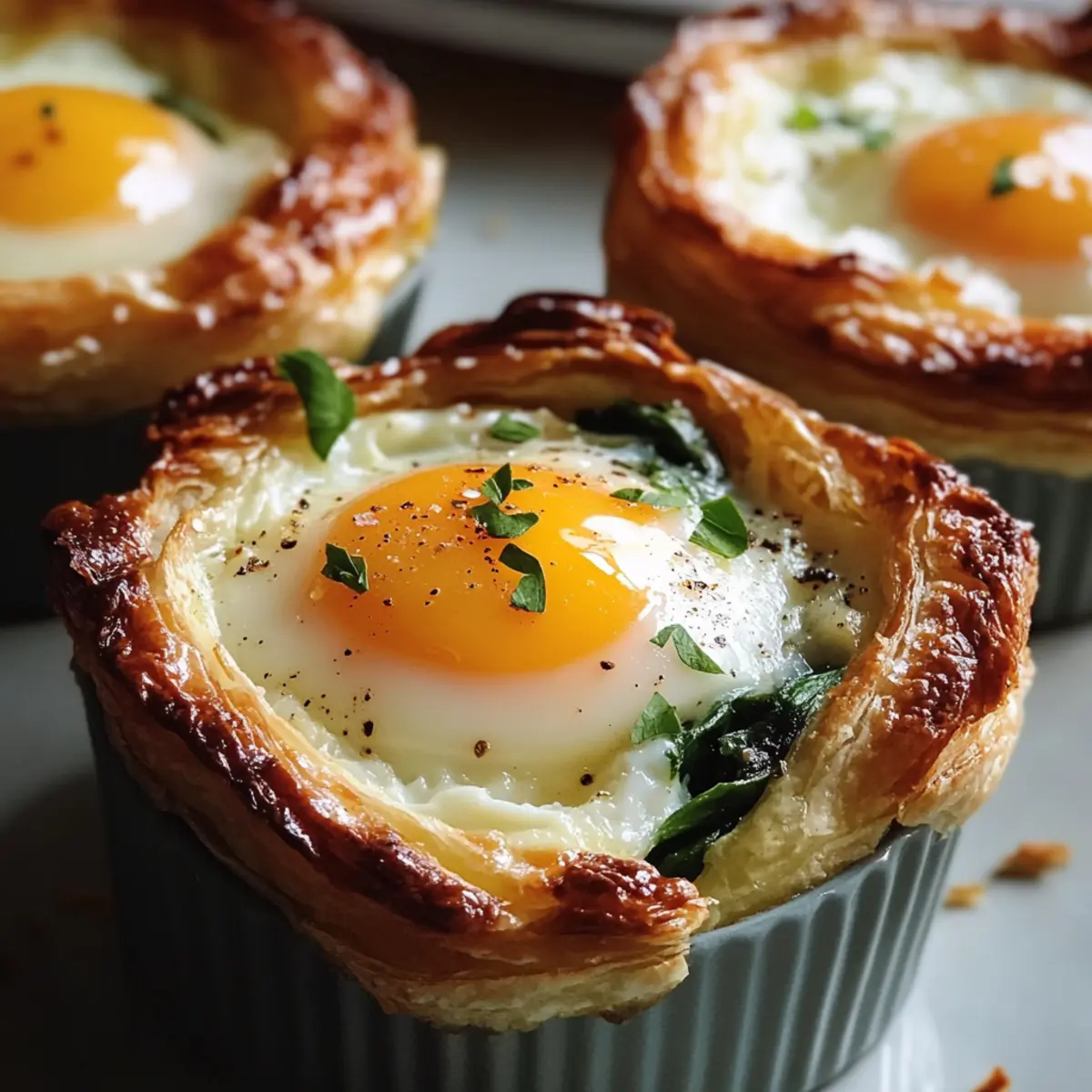Die Fertige Spinatfüllung gleichmäßig in die vorgebackenen Blätterteigschalen verteilen. Anschließend in jede Schale ein Ei aufschlagen, sodass das Eigelb in der Mitte bleibt. Leicht mit Salz und Pfeffer würzen, um den Geschmack zu intensivieren.