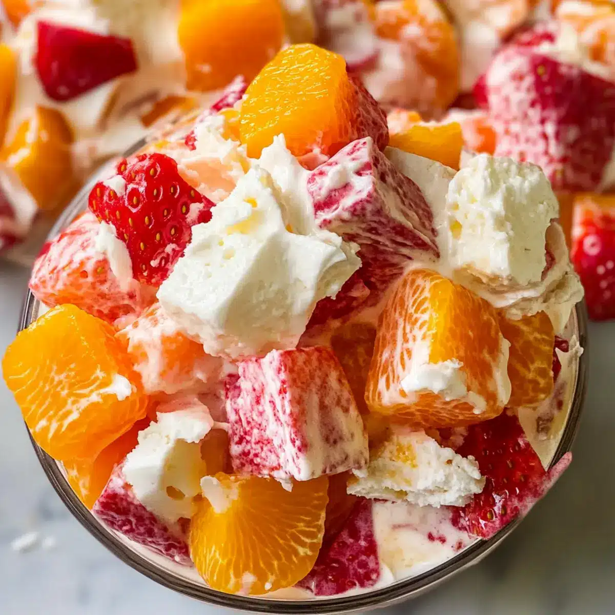 Gib die gelierten Würfel in eine große Rührschüssel und füge die vorbereiteten Früchte sowie die aufgetaute Cool Whip hinzu. Mit einem großen Löffel vorsichtig alles vermischen, bis die Früchte gleichmäßig mit der Gelatine und Cool Whip umhüllt sind. Sei sanft, damit die Gelatine-Würfel nicht zerfallen.