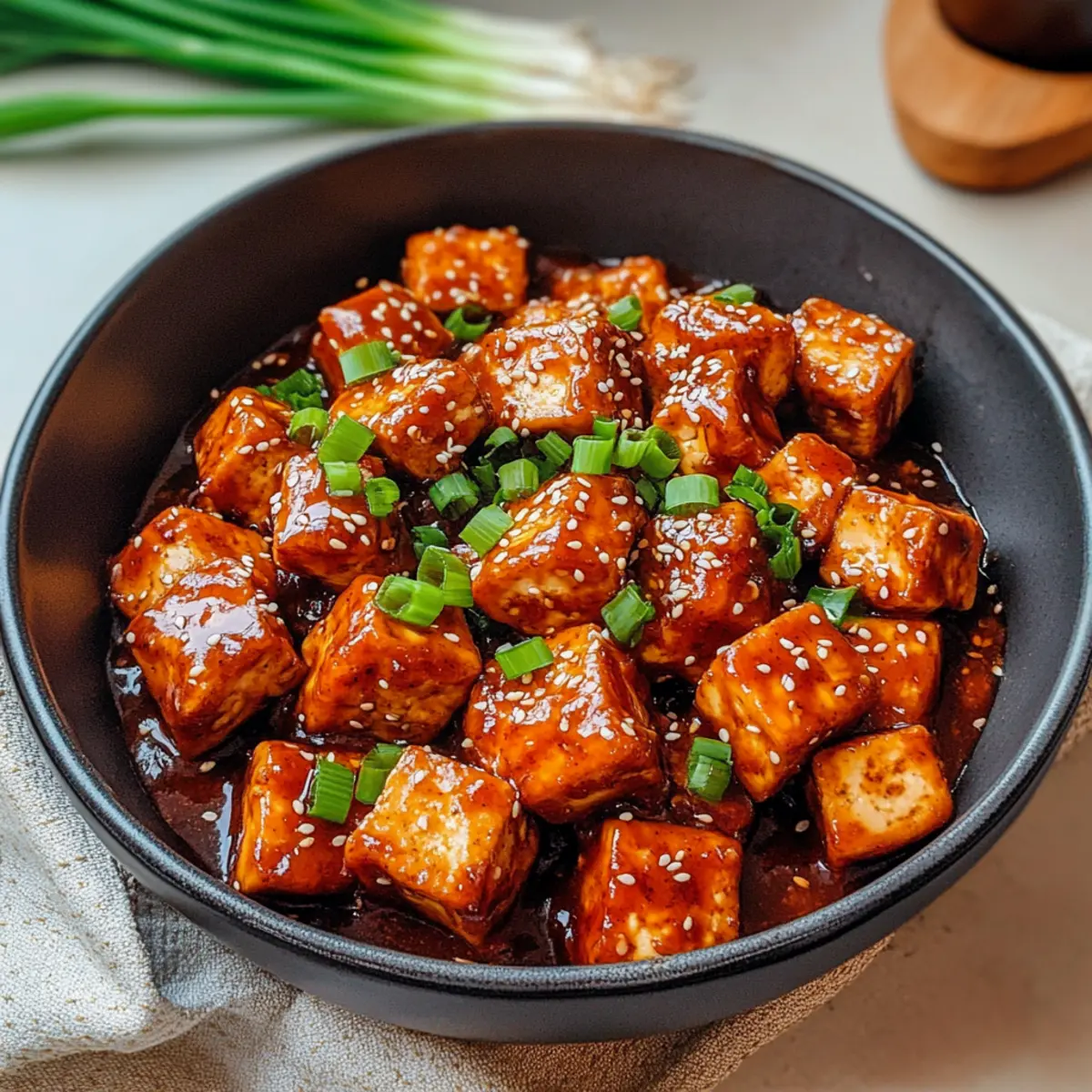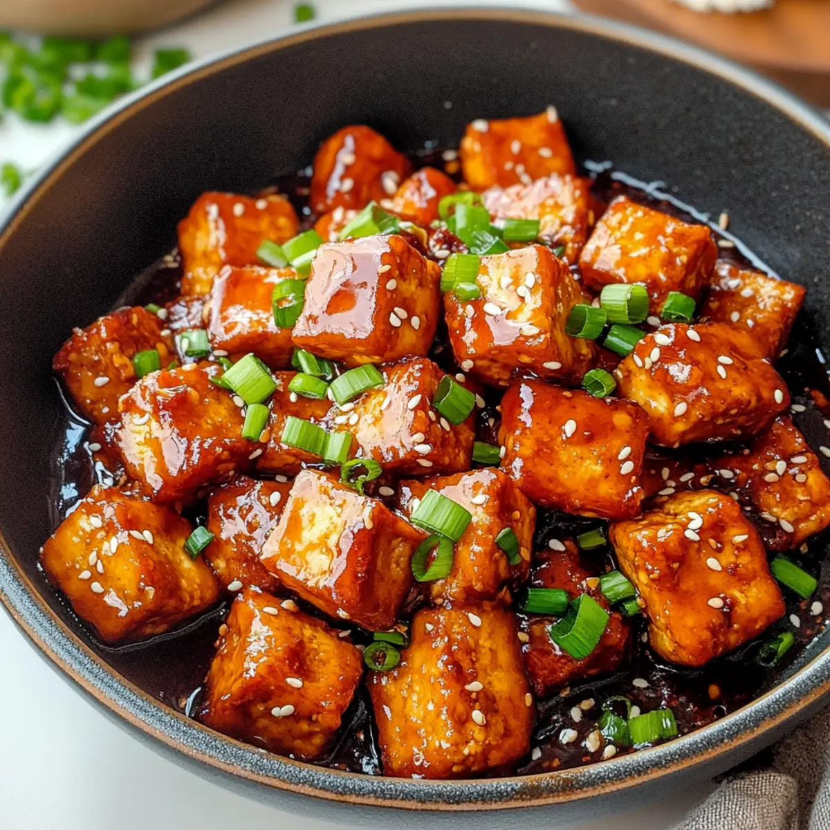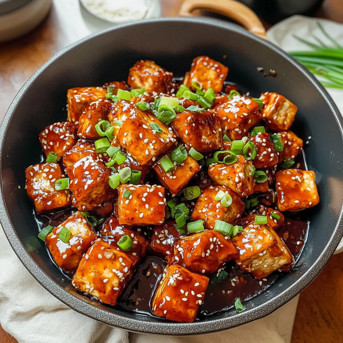 Nehme die Pfanne vom Herd und garniere dein köstliches General Tso’s Tofu mit gerösteten Sesamkernen und frisch gehackten grünen Zwiebeln. Serviere das Gericht sofort mit fluffigem Reis oder deinem bevorzugten Getreide, um das Geschmackserlebnis zu vervollständigen.