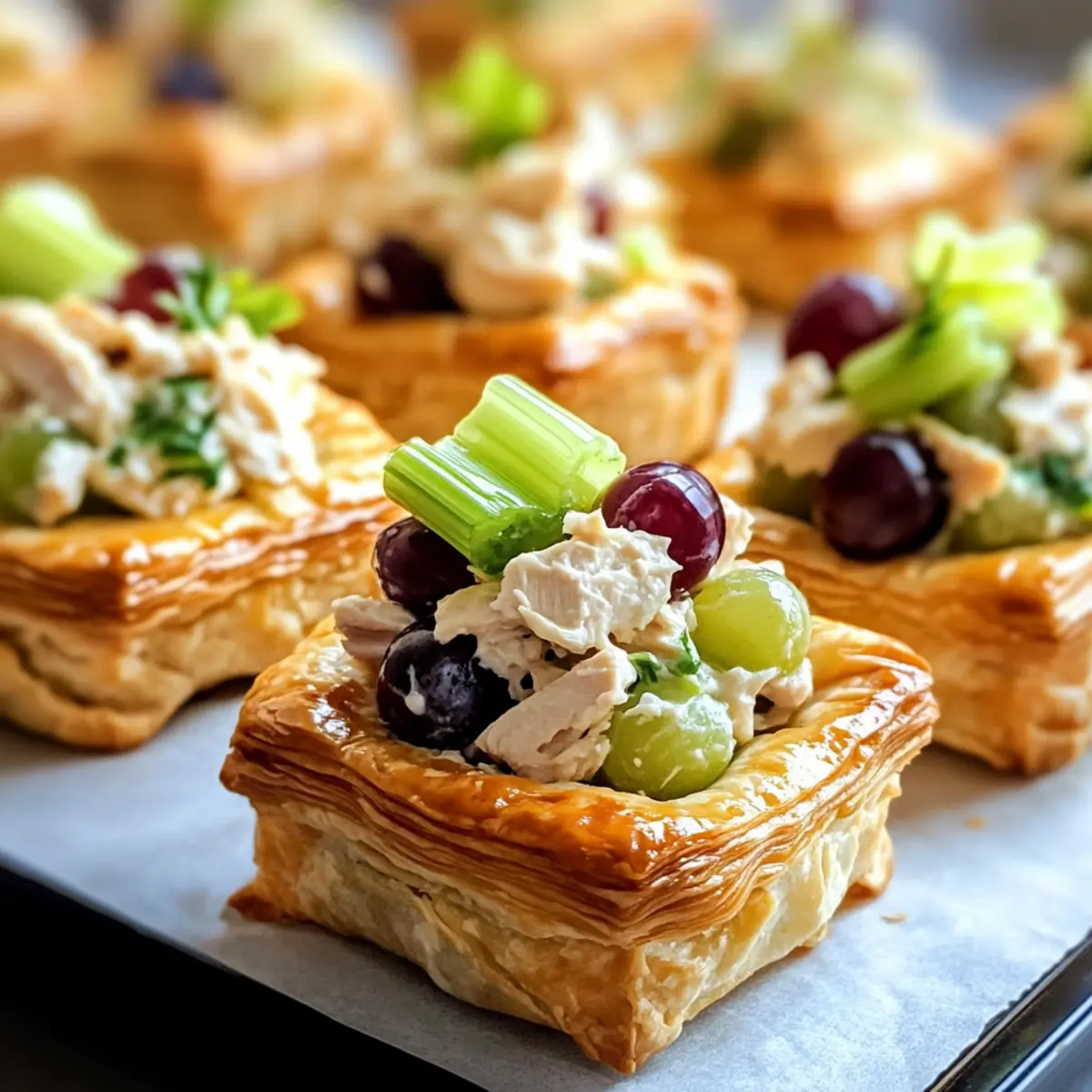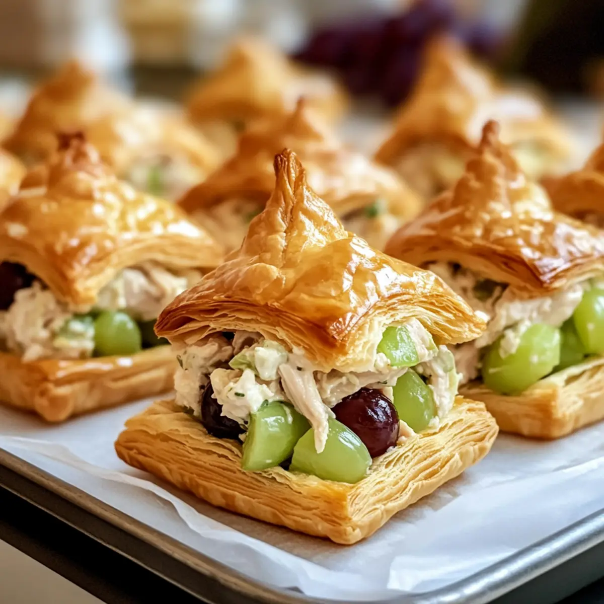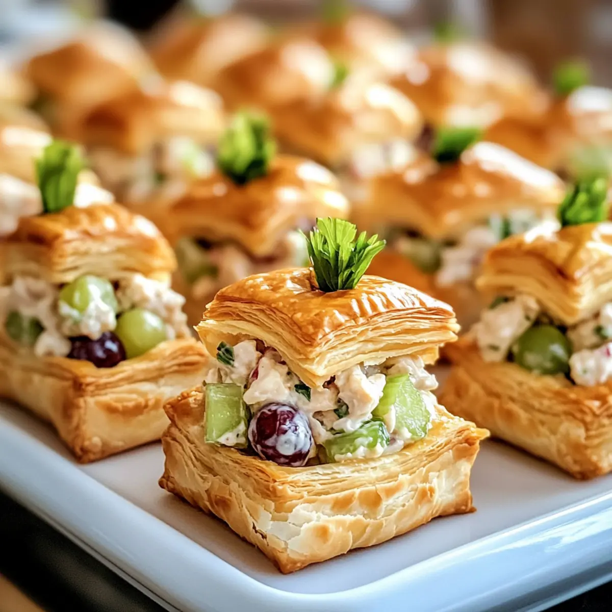- Teilchen zusammensetzen: Schneiden Sie die Blätterteigquadrate in der Mitte und füllen Sie die unteren Hälften mit der Hühnchensalat-Mischung. Drücken Sie die oberen Hälften leicht an und verwenden Sie Zahnstochern zum Fixieren.