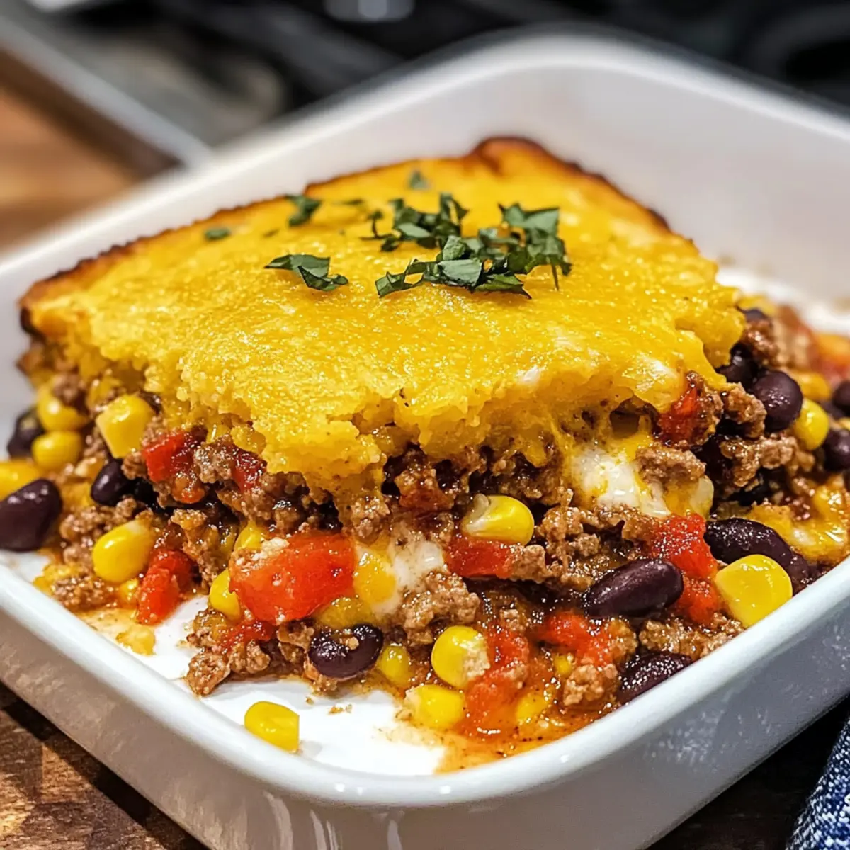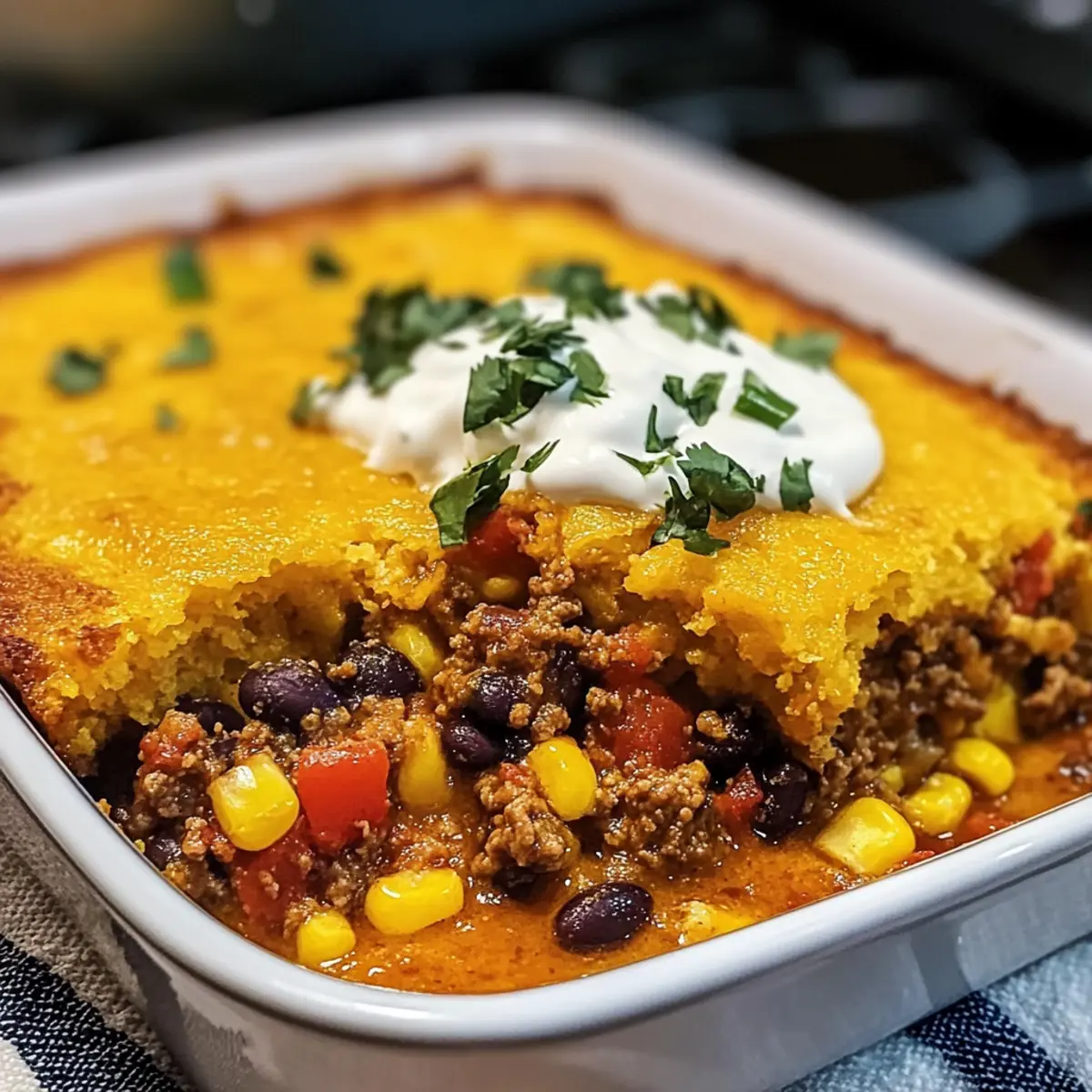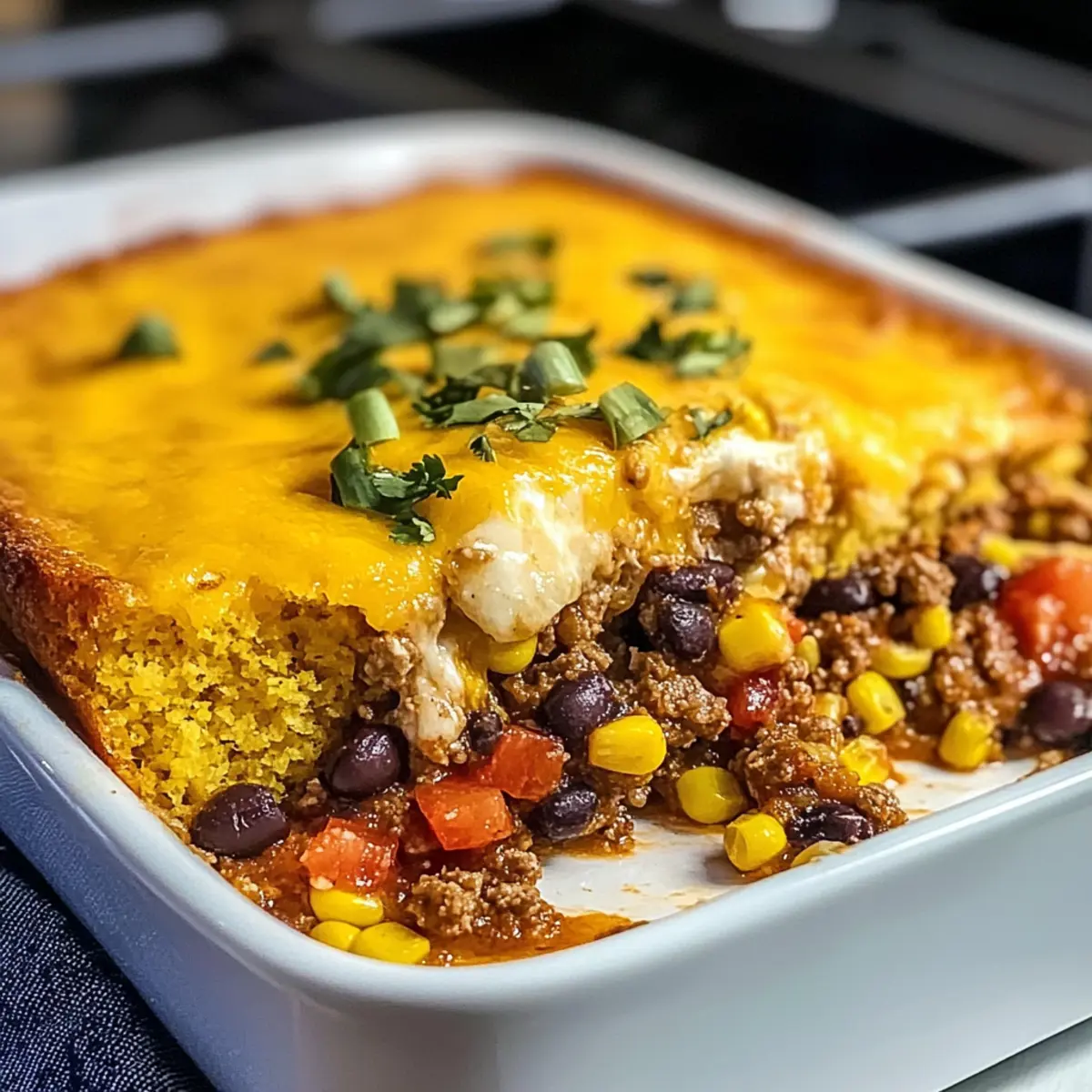 - Stellen Sie die Auflaufform in den vorgeheizten Ofen und backen Sie den Käse-Maisbrot-Taco-Auflauf für 25-30 Minuten. Achten Sie auf eine goldbraune Farbe des Maisbrottoppings.