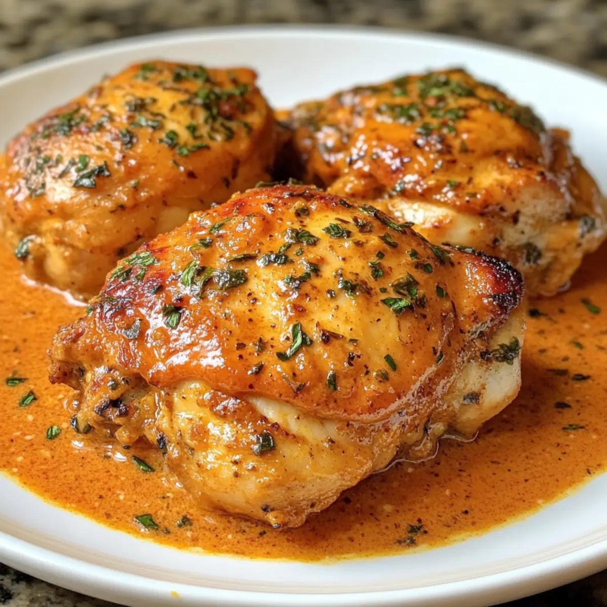 Legen Sie die goldbraun angebratenen Hähnchenoberschenkel zurück in die Pfanne. Lassen Sie alles zusammen 1–2 Minuten köcheln, damit das Hähnchen durch wärmt und die Aromen sich verbinden. Achten Sie darauf, dass das Hähnchen gleichmäßig in der Sauce liegt, damit jedes Stück gut mariniert wird.