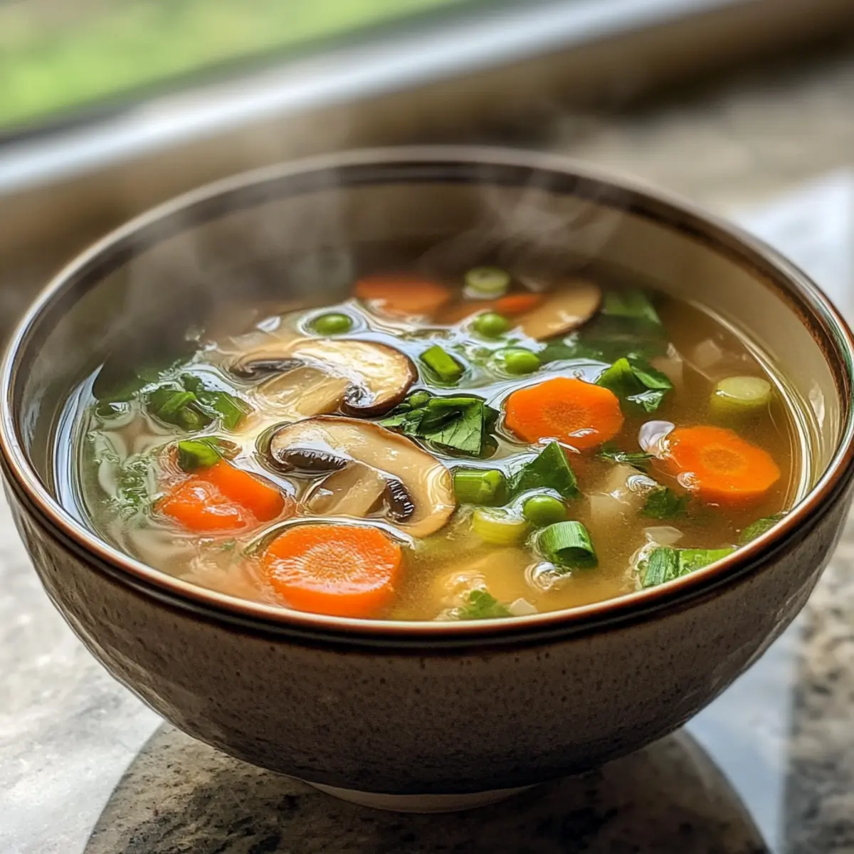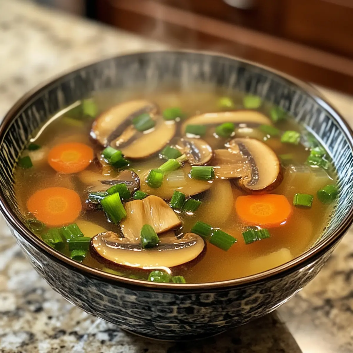 Lade die heiße Brühe in Suppenschalen und garniere sie mit 2-3 fein geschnittenen Frühlingszwiebeln und einer Handvoll Champignons. Diese frischen Zutaten sorgen für eine schöne Präsentation. Serviere die klare Suppe sofort, damit die Aromen frisch und die Texturen angenehm bleiben.