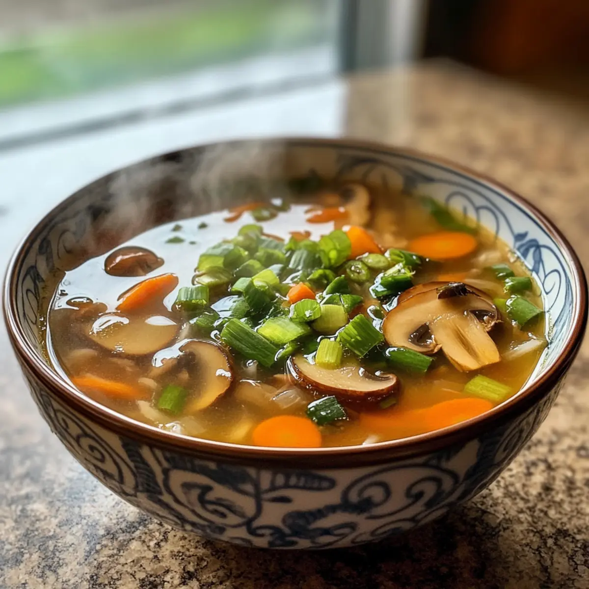 - Lade die heiße Brühe in Suppenschalen und garniere sie mit 2-3 fein geschnittenen Frühlingszwiebeln und einer Handvoll Champignons.