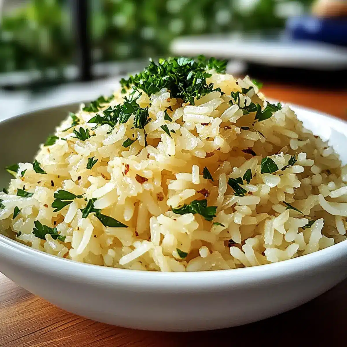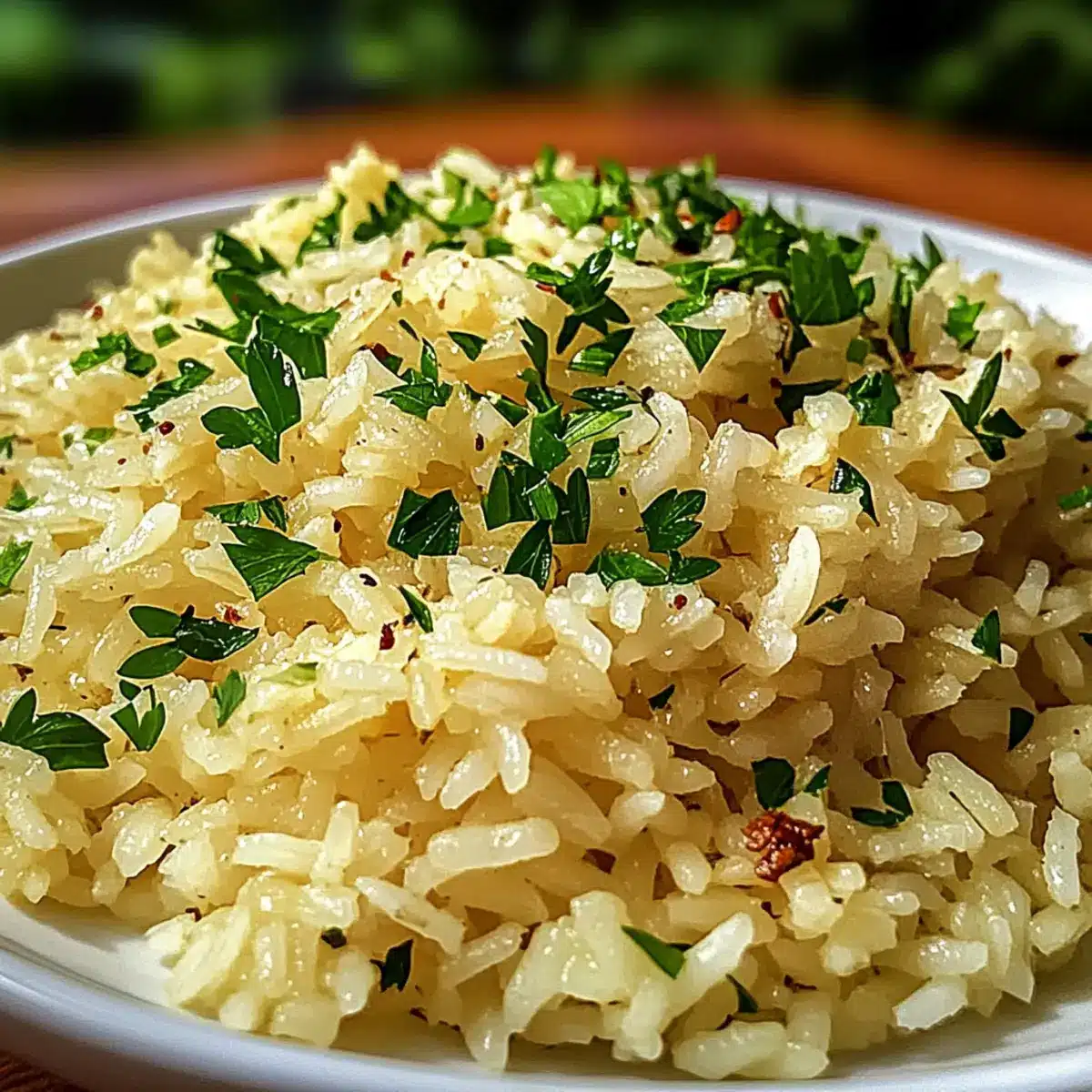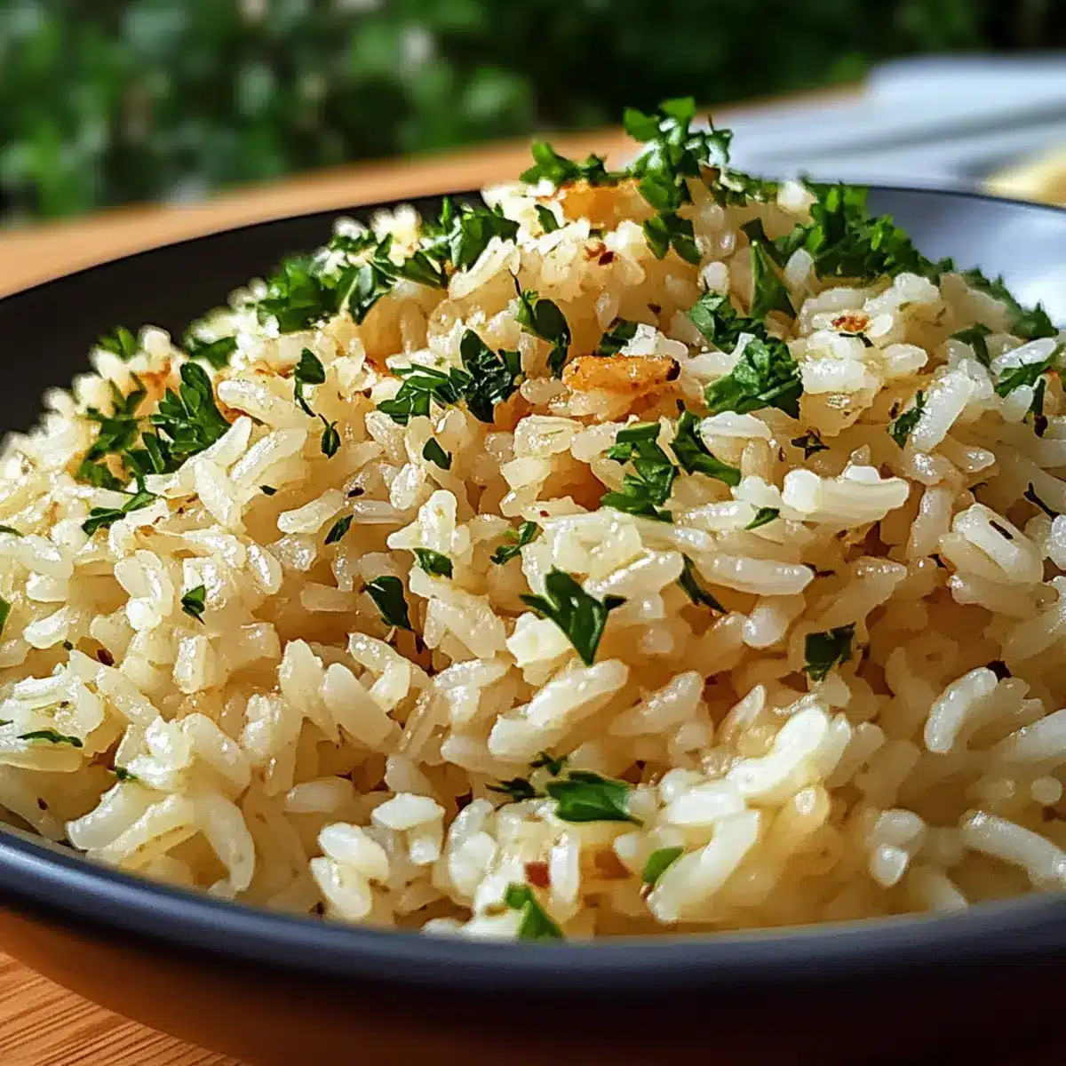 Kreativ garnieren: Ergänze den Knoblauchbutterreis mit einer Spritz von Zitrone oder einem Hauch von Parmesan für einen zusätzlichen Geschmacksboost.