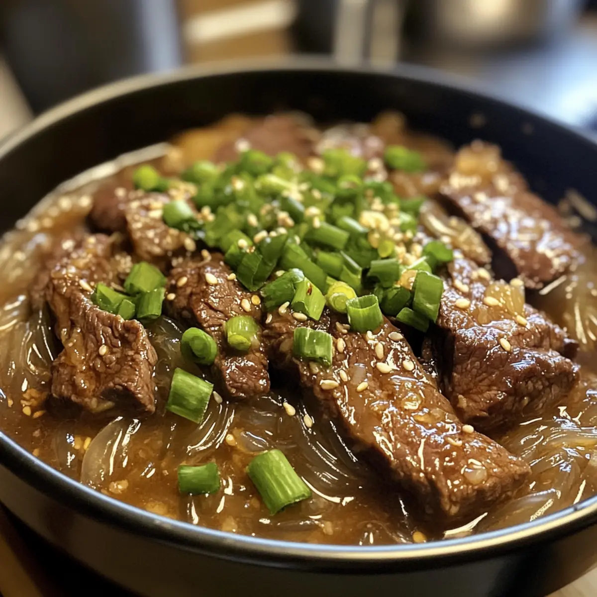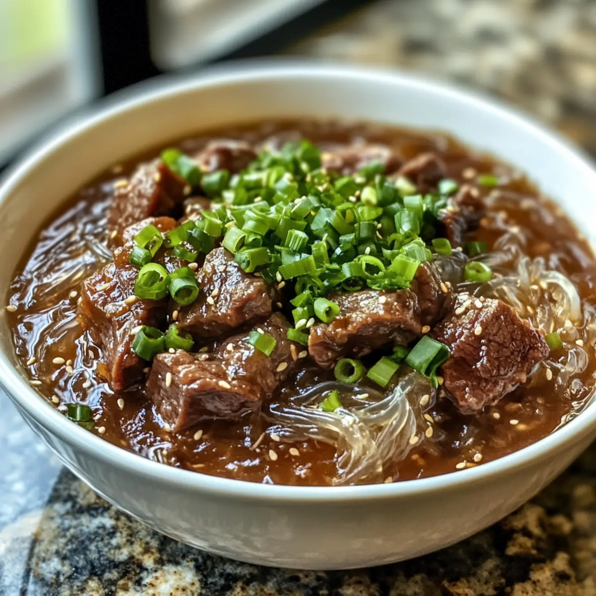 Aromatische Vielfalt: Die Kombination aus sesam-soy Brühe und zarten Rindfleischstücken sorgt für ein intensives Geschmackserlebnis, das jedem schmeichelt. Texturwunder: Die chewy Glasnudeln fangen die Aromen wunderbar ein und verleihen dem Gericht das gewisse Extra.