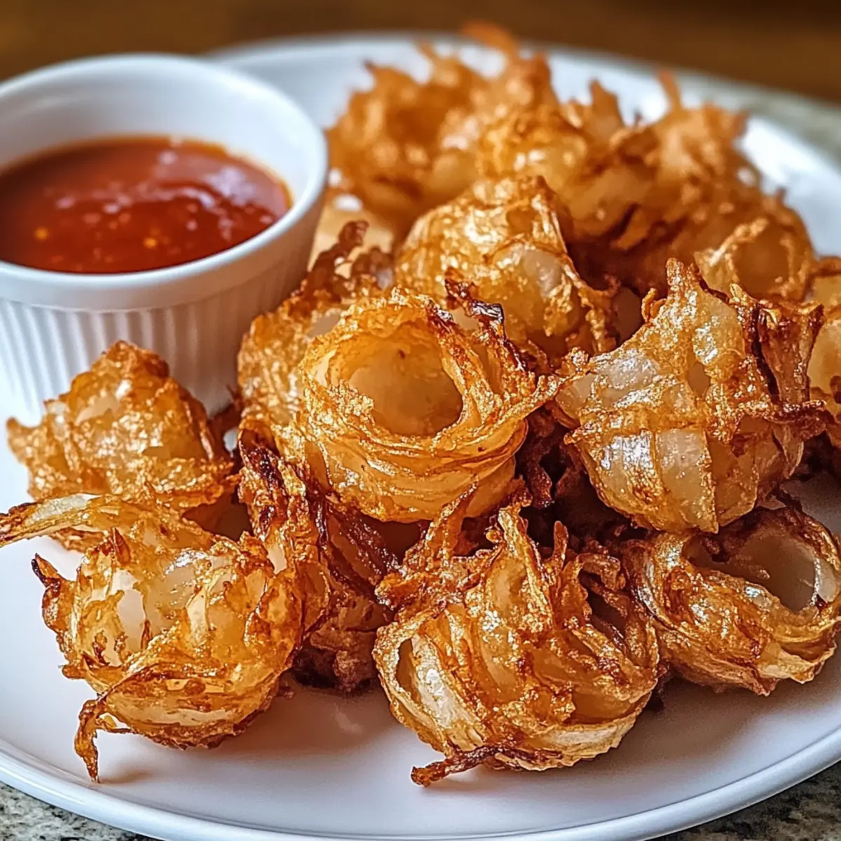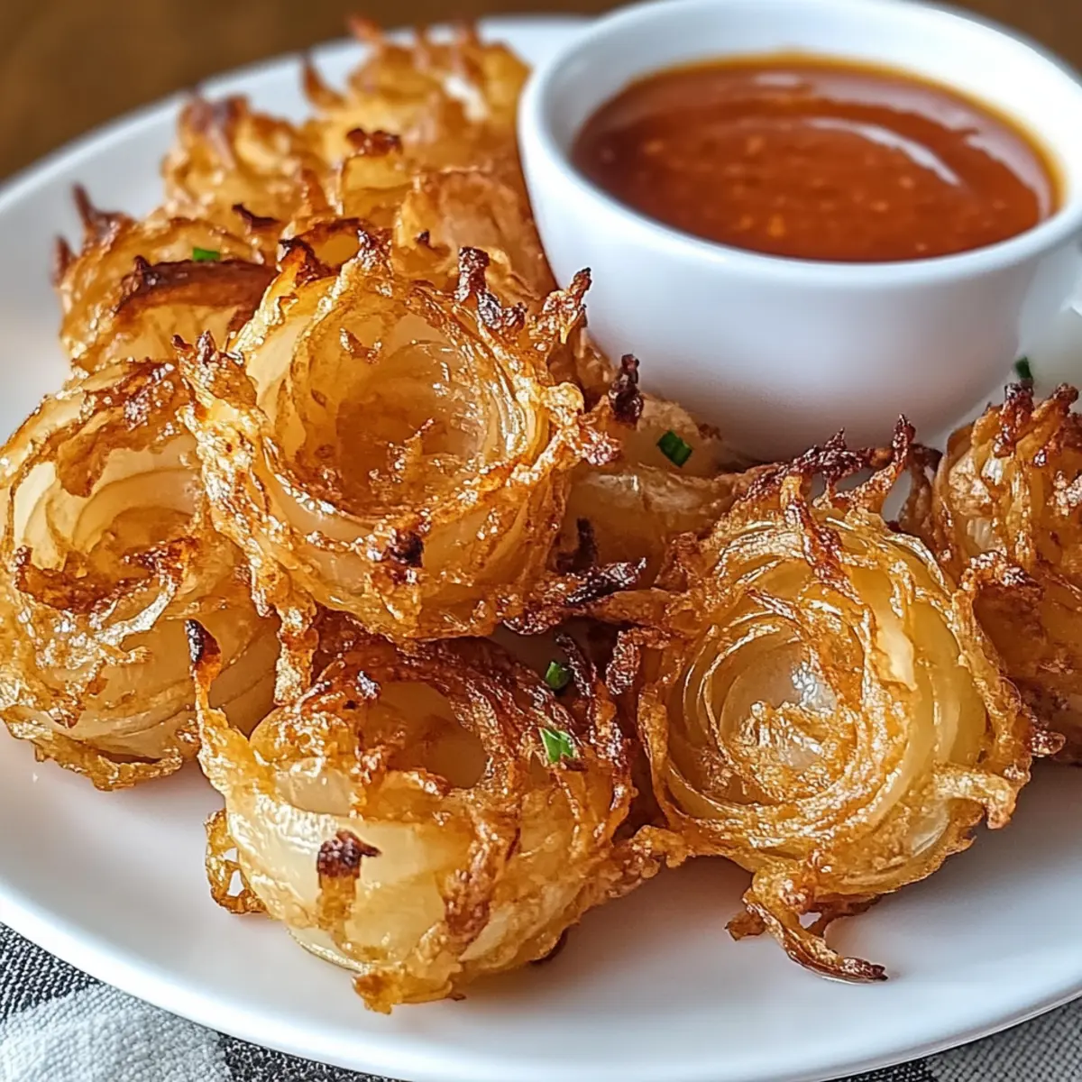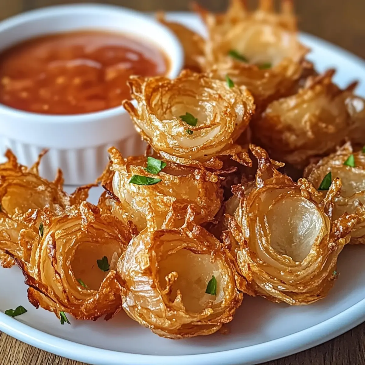 Genießen Sie diese knusprigen kleinen Zwiebelblüten mit köstlichen Beilagen, die jeden Bissen zu einem Geschmackserlebnis machen.