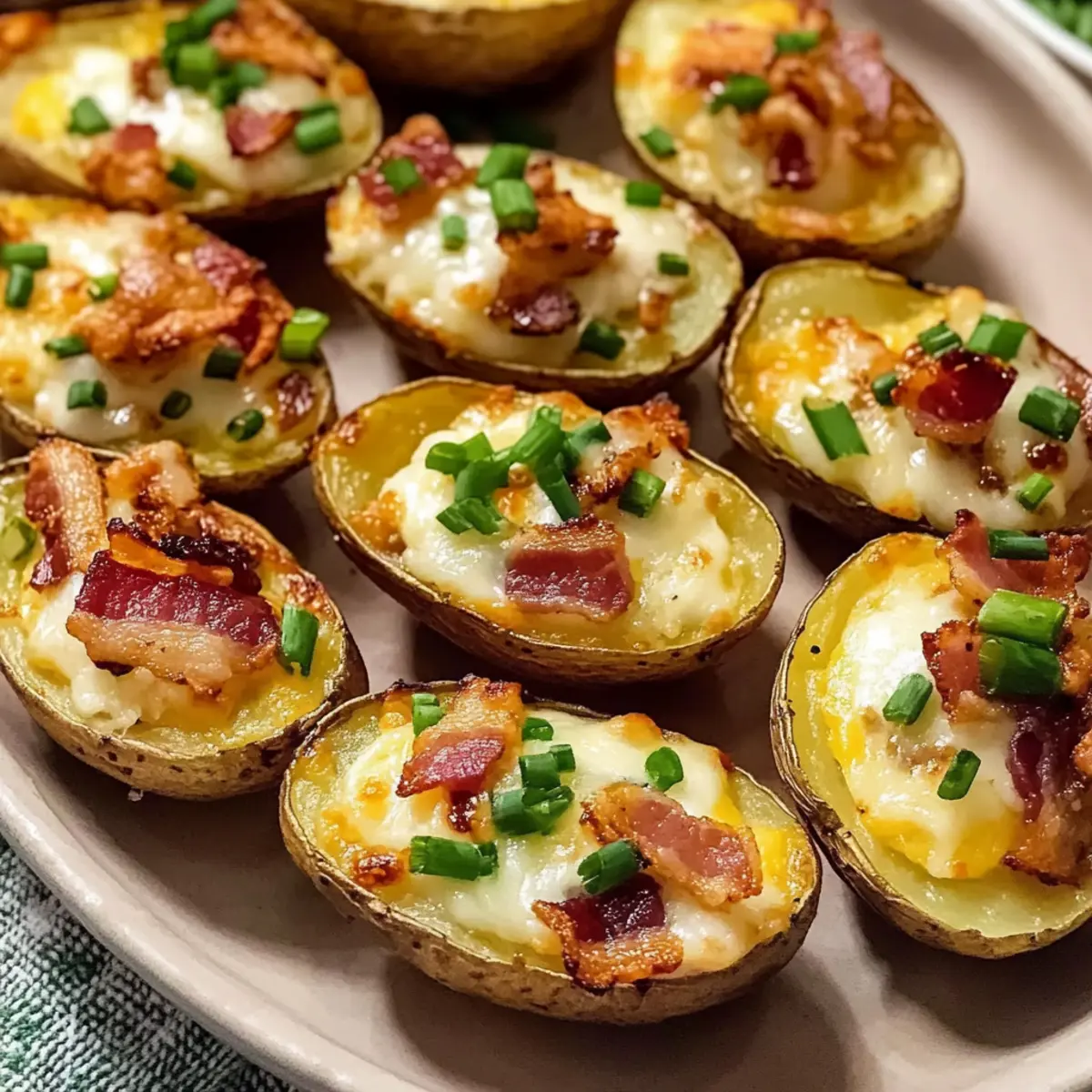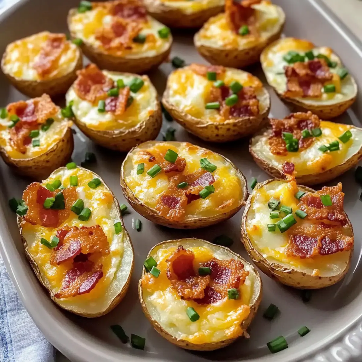 Die Vorbereitung dieser leckeren Mini-Kartoffelhaut ist ein Kinderspiel und perfekt für Ihre nächste Feier! Sie können die Kartoffelhälften und die Füllung bis zu 24 Stunden im Voraus zubereiten. Backen Sie die Kartoffeln wie angegeben vor, lassen Sie sie abkühlen und heben Sie die Füllung separat auf. Achten Sie darauf, die Füllung in einem luftdichten Behälter zu lagern, um ihre Frische zu bewahren. Am Tag Ihrer Feier erwärmen Sie die gefüllten Kartoffeln einfach im Backofen bei 190 °C für 8-10 Minuten bis sie golden und heiß sind. So sparen Sie Zeit und genießen trotzdem frische, köstliche Mini-Kartoffelhaut, die Ihre Gäste begeistern wird!