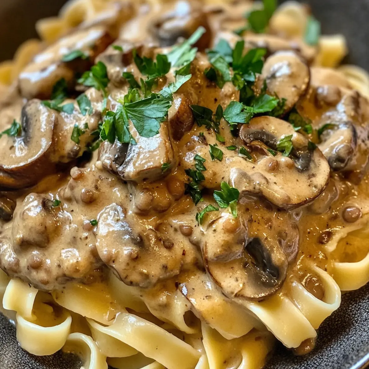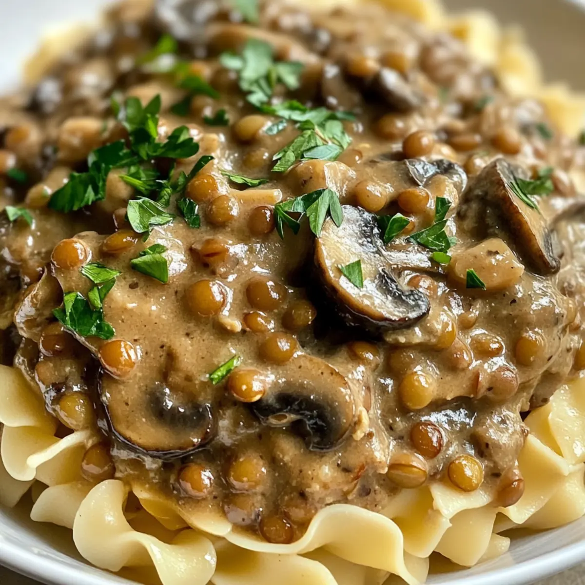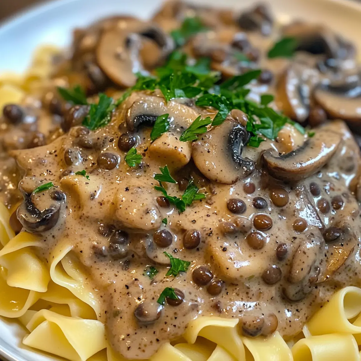 - Anrichten und servieren: Serviere das Linsen-Pilz-Stroganoff über den warmen Nudeln und garniere großzügig mit frisch gehackter Petersilie.