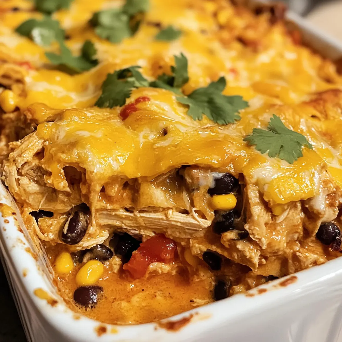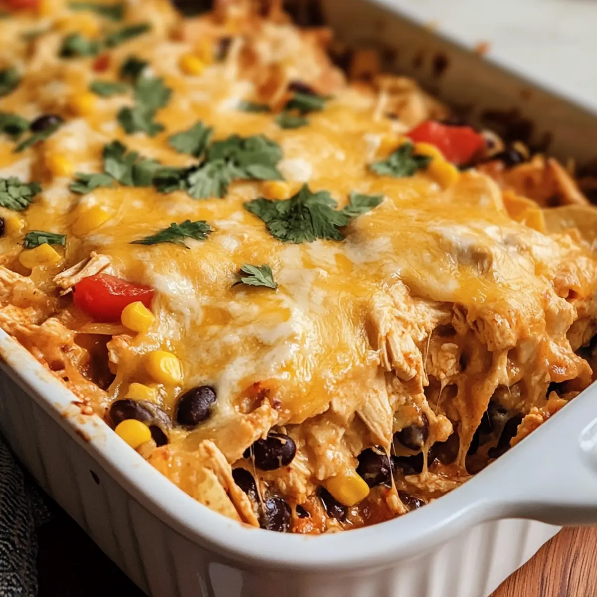 Lassen Sie den Auflauf nach dem Backen etwa 5 Minuten abkühlen, bevor Sie ihn servieren. So setzen sich die Schichten und der Auflauf ist leichter zu portionieren. Garnieren Sie nach Belieben mit frischem Koriander oder einem Klecks Sauerrahm, um den Mexikanischen Hühnchenauflauf noch schmackhafter zu machen.