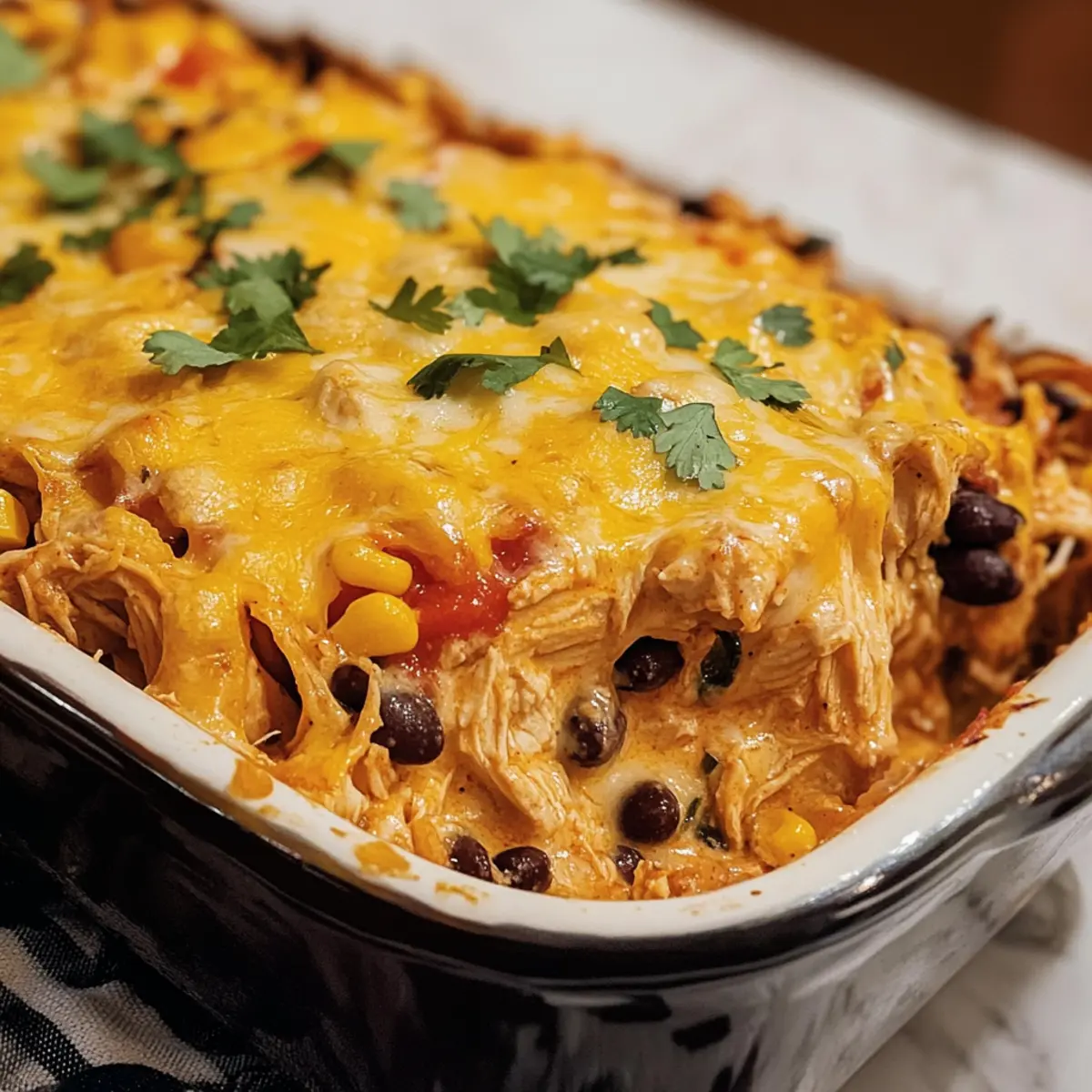 - Lassen Sie den Auflauf 5 Minuten abkühlen, bevor Sie ihn servieren. Garnieren Sie nach Belieben mit frischem Koriander oder Sauerrahm.