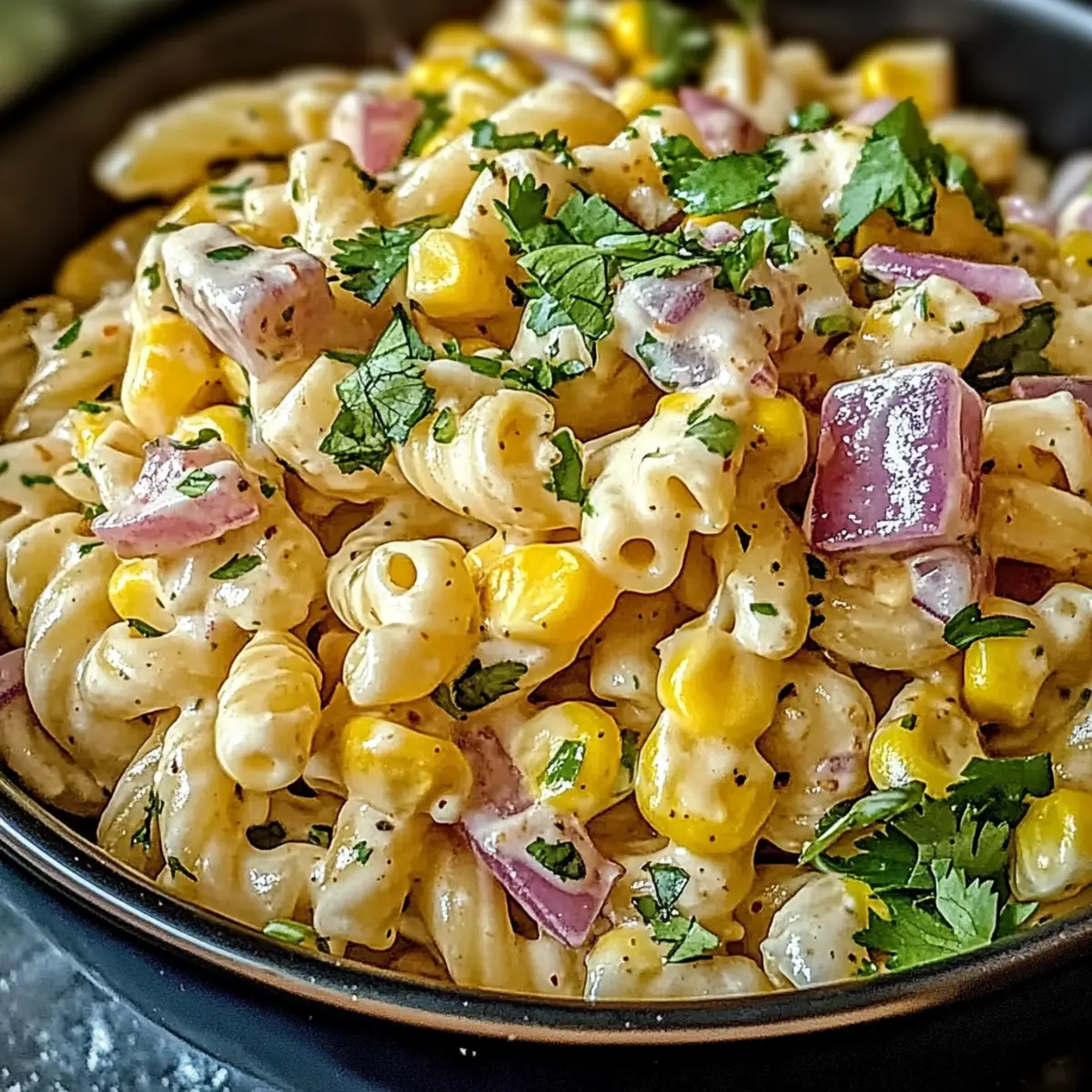 In einer großen Schüssel die abgekühlte Pasta, den vorbereiteten Mais, geschnittene Kirschtomaten, fein gewürfelte rote Zwiebel, frischen Koriander und zerbröselten Cotija-Käse vorsichtig miteinander vermengen. Achte darauf, dass alle Zutaten gleichmäßig verteilt sind und die bunten Farben sichtbar bleiben, um eine appetitliche Optik zu erzeugen.