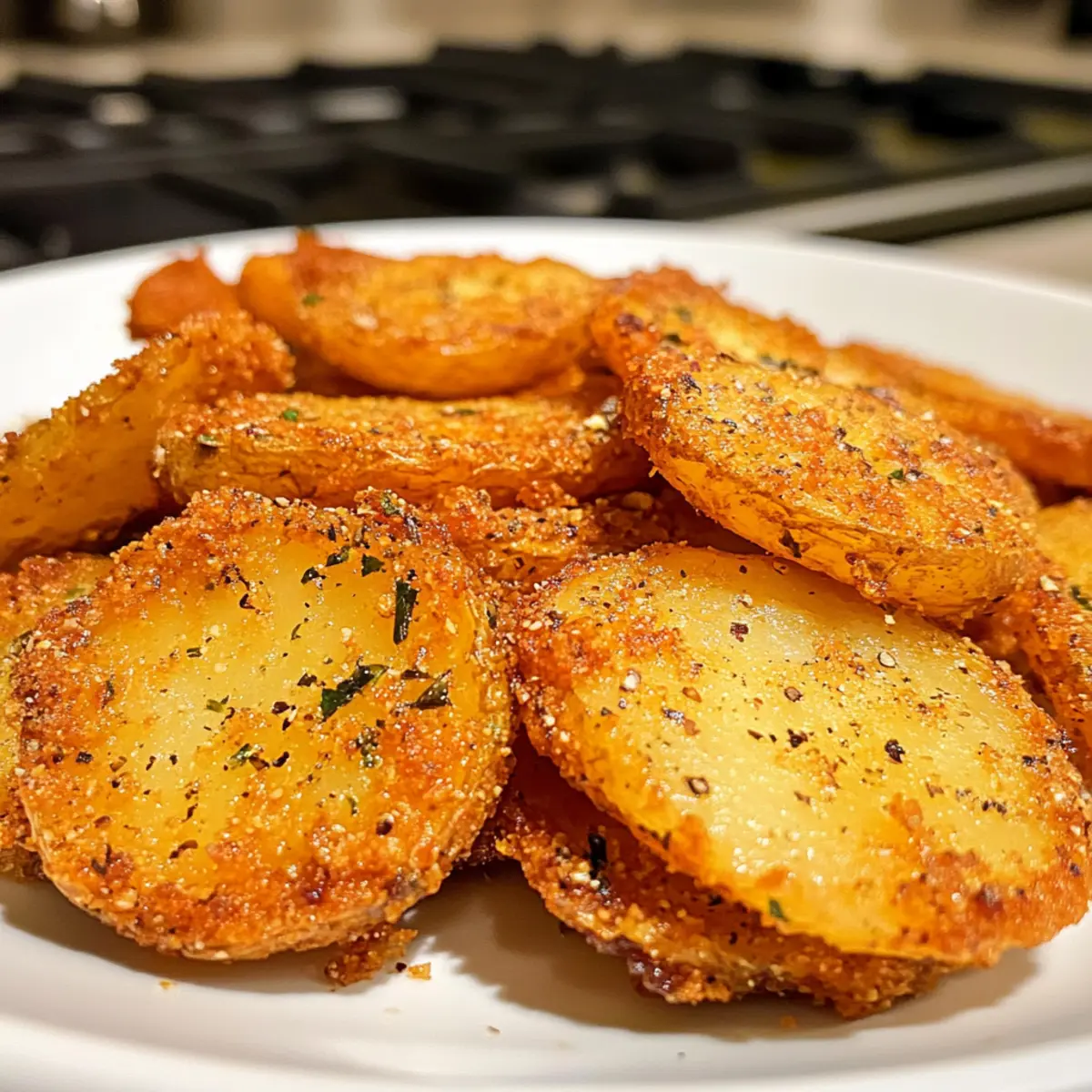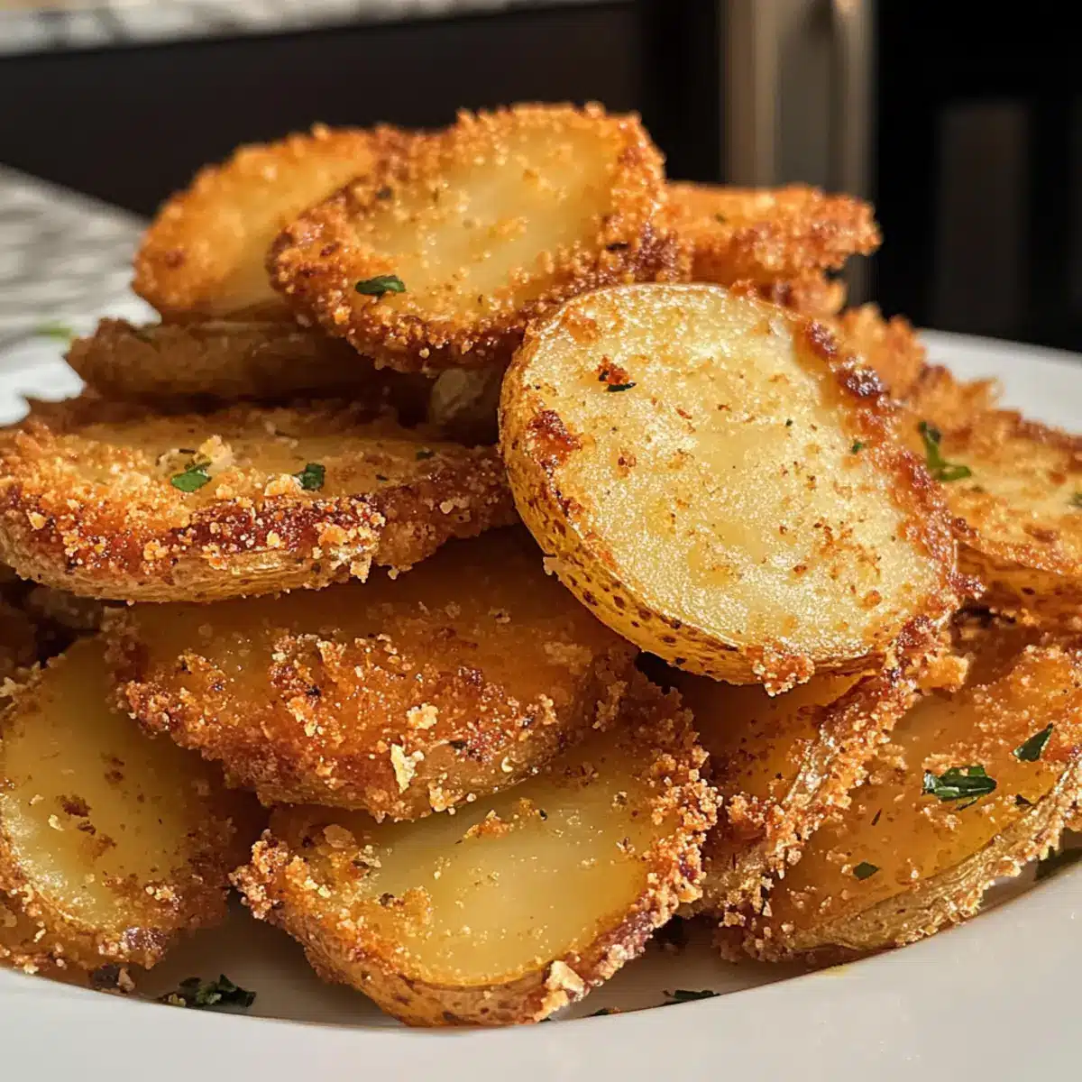 - Paniere jede Kartoffelscheibe in der Panade und schüttel überschüssige Panade ab.