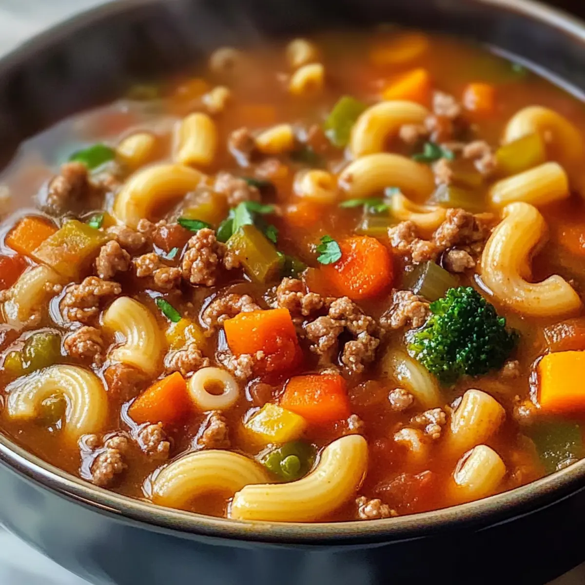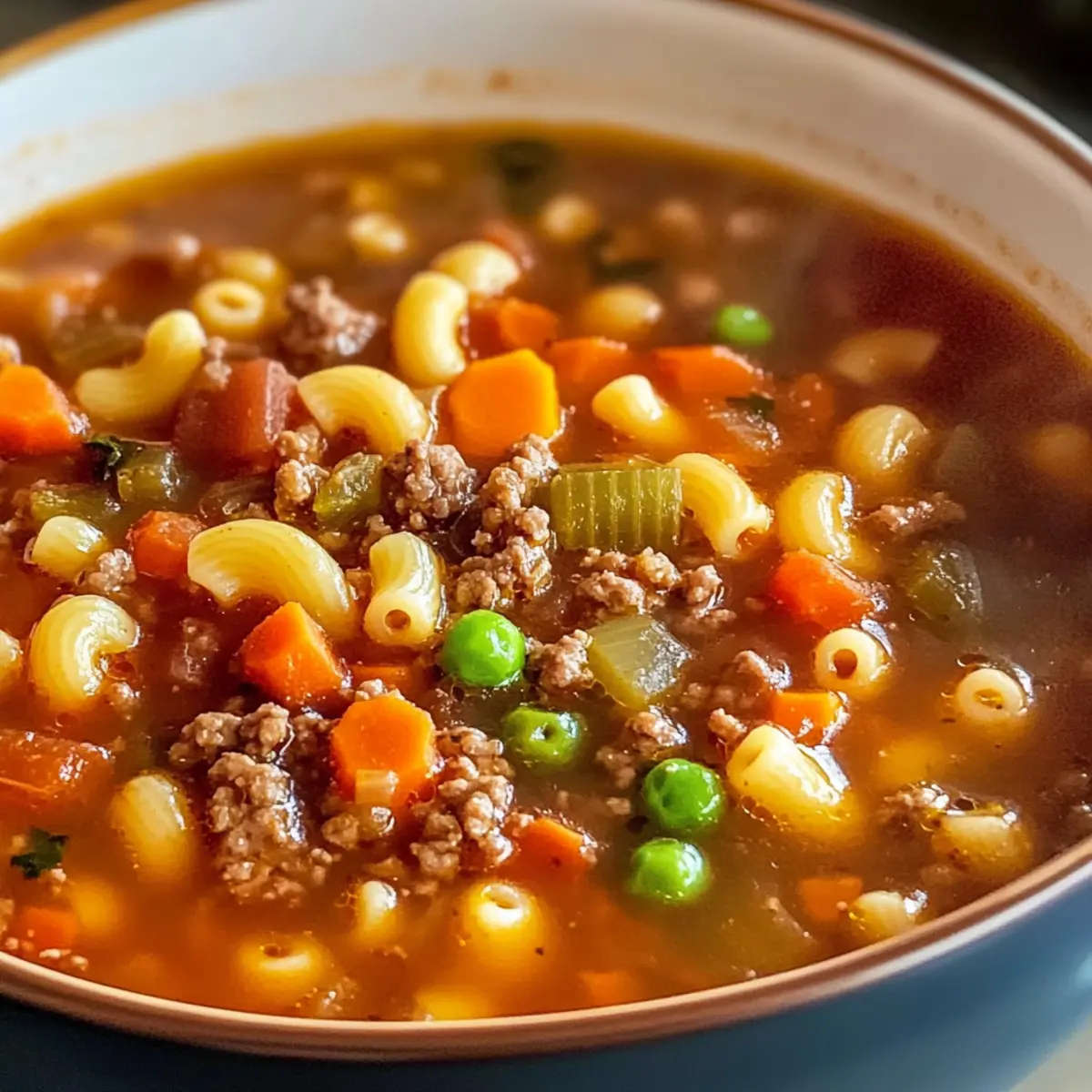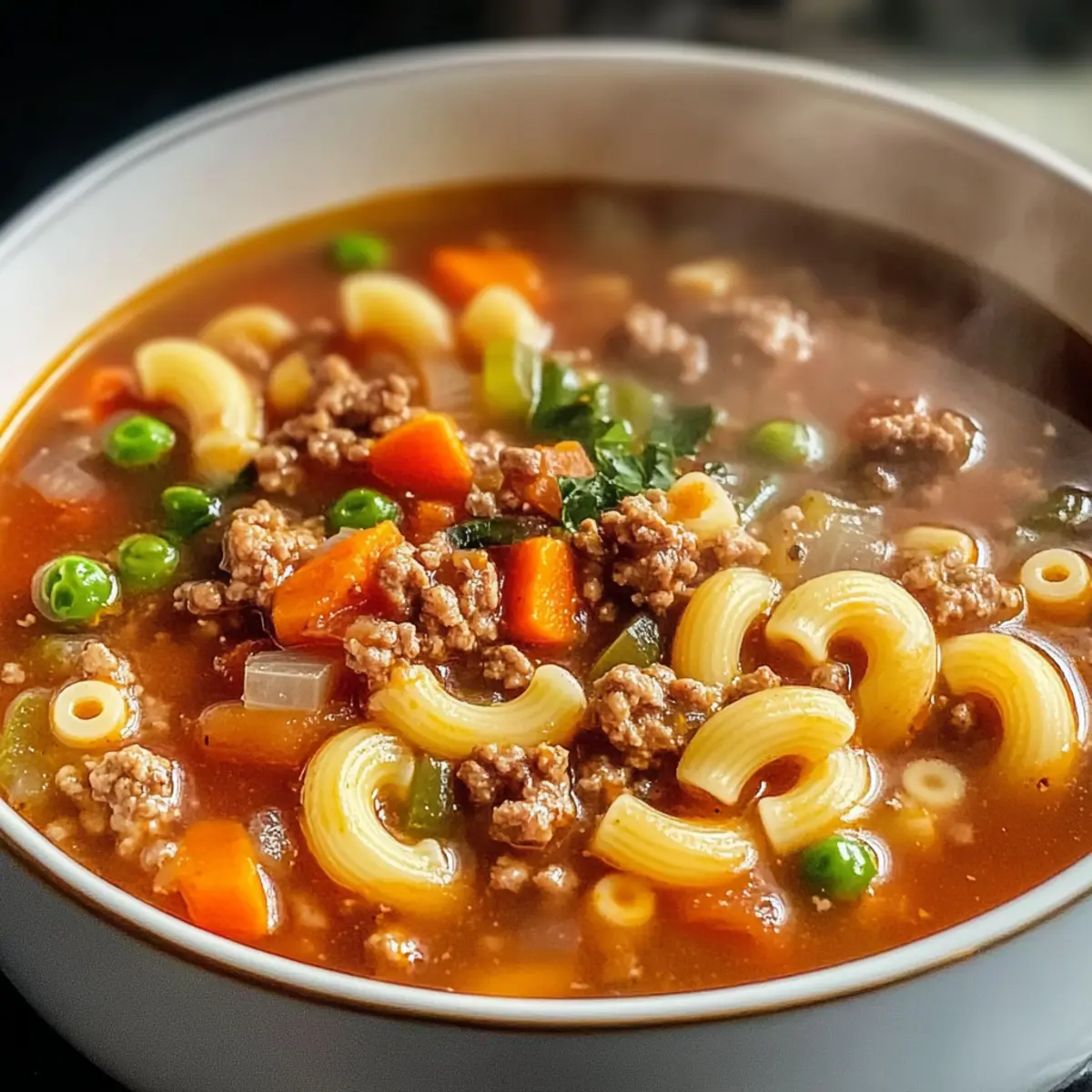 Genieße das Kochen dieser Rinderhackfleisch Pasta Suppe, die nicht nur schnell, sondern auch sättigend und nahrhaft ist!