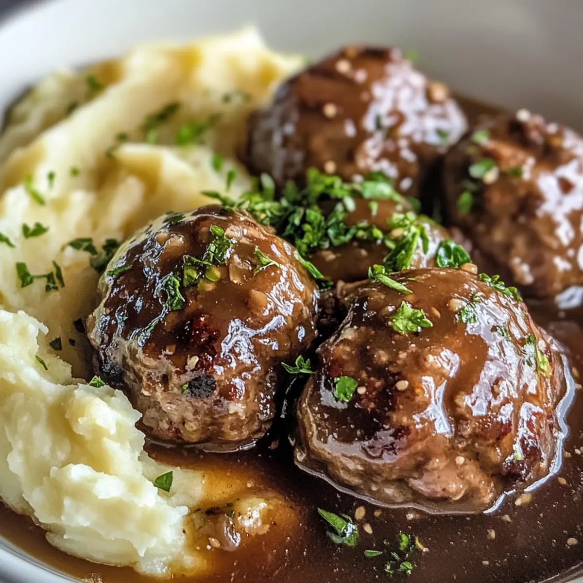 Sobald die Fleischbällchen gebacken sind, gib sie vorsichtig in die Pfanne mit der Soße und wende sie, bis sie vollständig mit der herzhaften Sauce überzogen sind. Serviere die feinen Salisbury Steak Fleischbällchen zusammen mit dem cremigen, mit Knoblauch verfeinerten Kartoffelpüree und genieße dieses köstliche Familienessen.