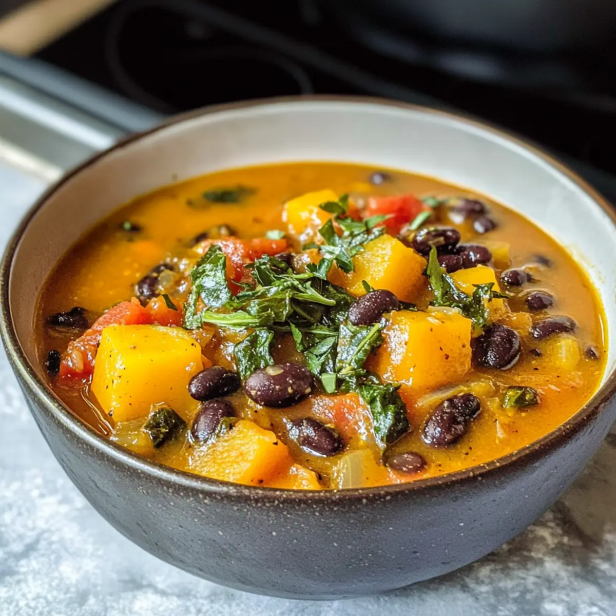 Wärmendes Aroma: Der Schwarze-Bohnen-Butternusskürbis-Eintopf verführt mit seinen einladenden Düften, die durch die Kombination von Kräutern und Gewürzen entstehen.