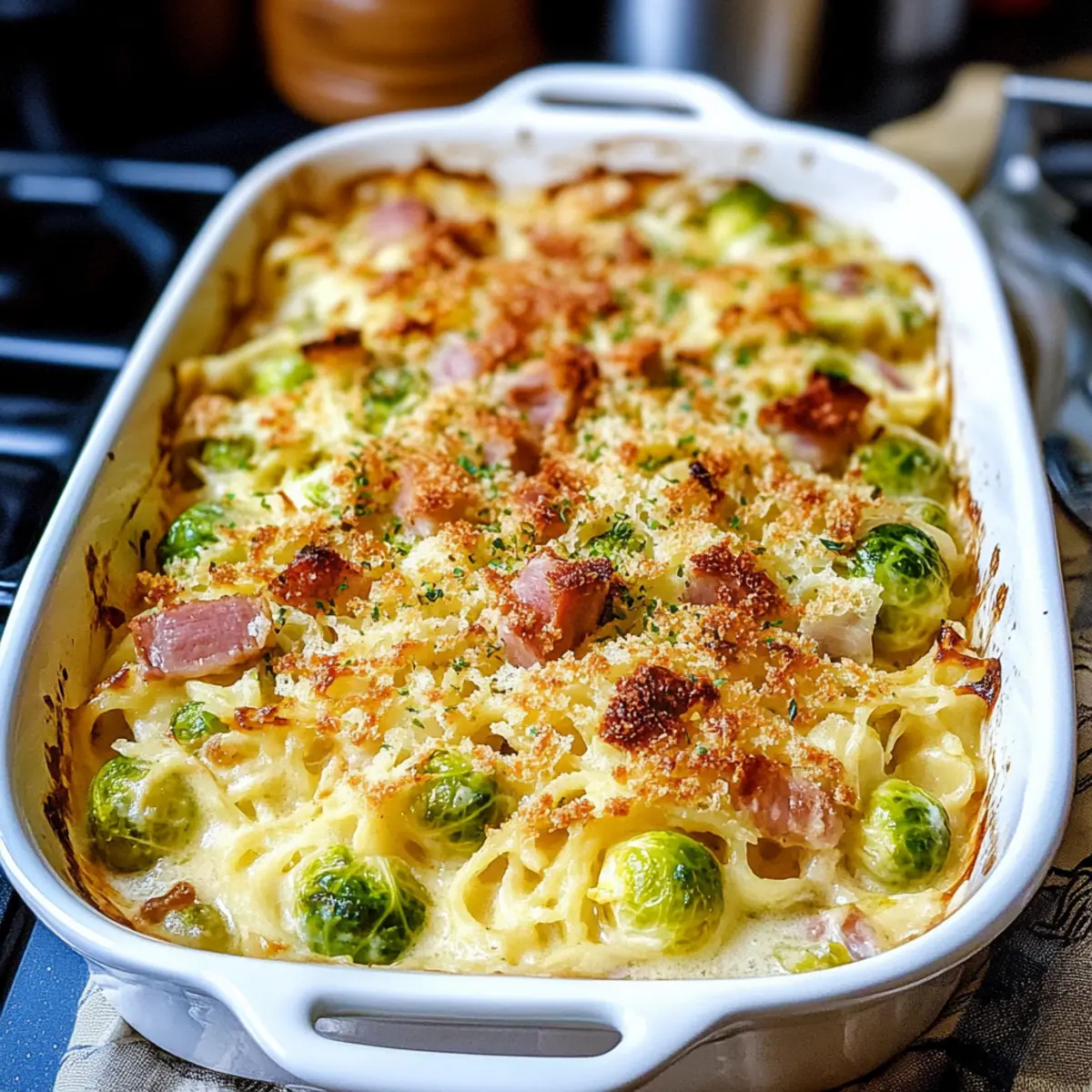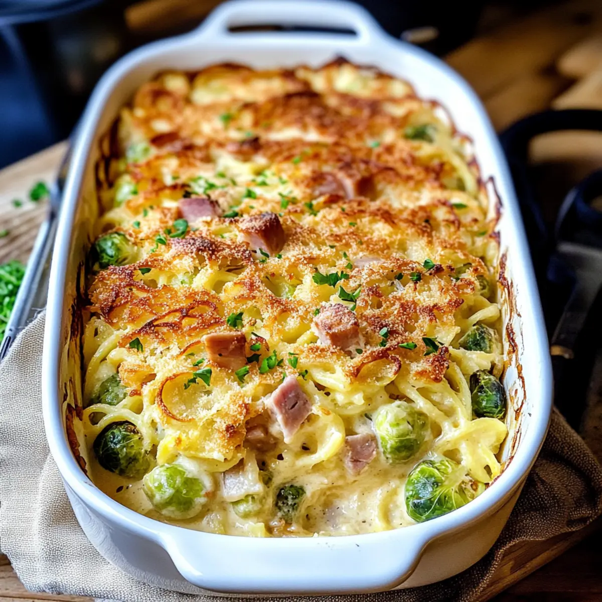 Spätzleauflauf mit Rosenkohl und Kasseler Zutaten