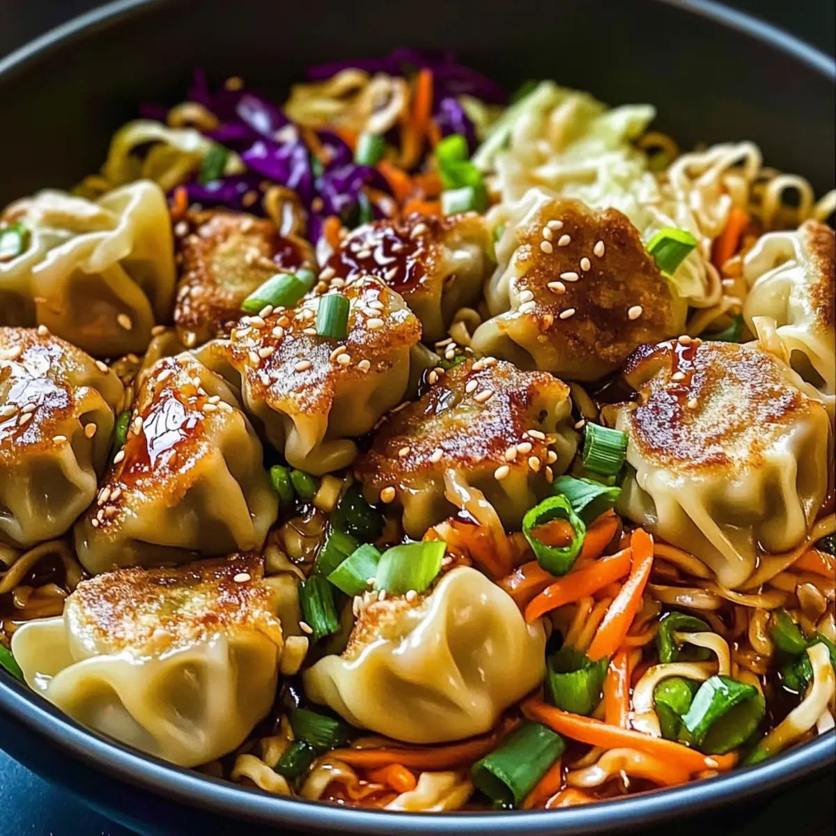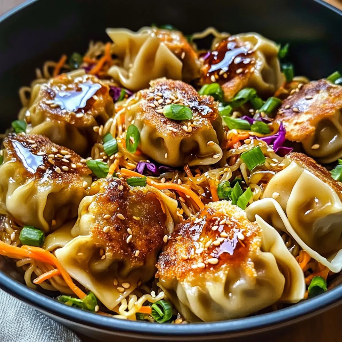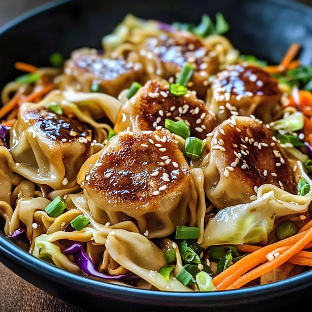 Nestle die knusprigen Potstickers vorsichtig in die Nudel-Gemüse-Mischung in der Pfanne. Garniere das Gericht nach Belieben mit frisch gehackten Frühlingszwiebeln und optionalen Sesamsamen für zusätzlichen Crunch. Serviere die Teigtaschen-Nudel-Schüsseln sofort heiß, damit alle Aromen zur Geltung kommen und die Gerichte frisch und einladend bleiben.