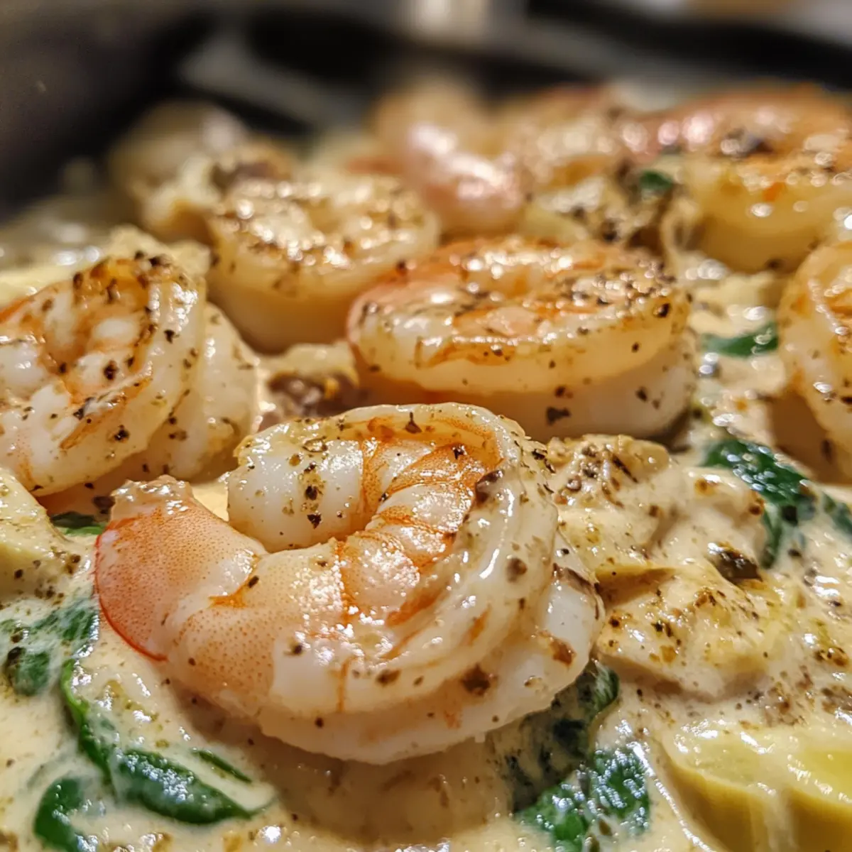 - Gib die angebratenen Garnelen wieder in die Pfanne und löffle die cremige Soße über sie. Lasse alles zusammen für weitere 2 Minuten köcheln, bis die Garnelen durchgegart und gut erwärmt sind. Achte darauf, dass die Garnelen gleichmäßig von der Soße umhüllt sind, um ein köstliches Ergebnis zu erzielen.
