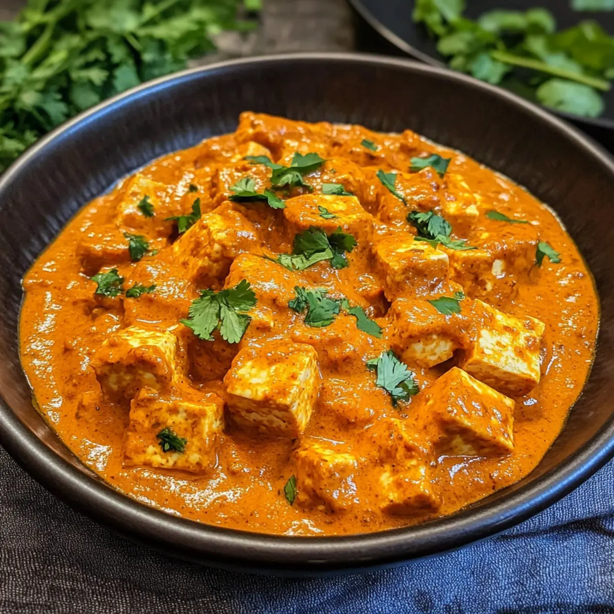 Zum Schluss garnieren die veganen Tofu Tikka Masala mit frischem Koriander nach Belieben. Schmeckt das Gericht ab und passt die Gewürze an euren Geschmack an. Serviert das Gericht warm über Reis oder einer Alternativen und freut euch auf diesen geschmacklichen Genuss!