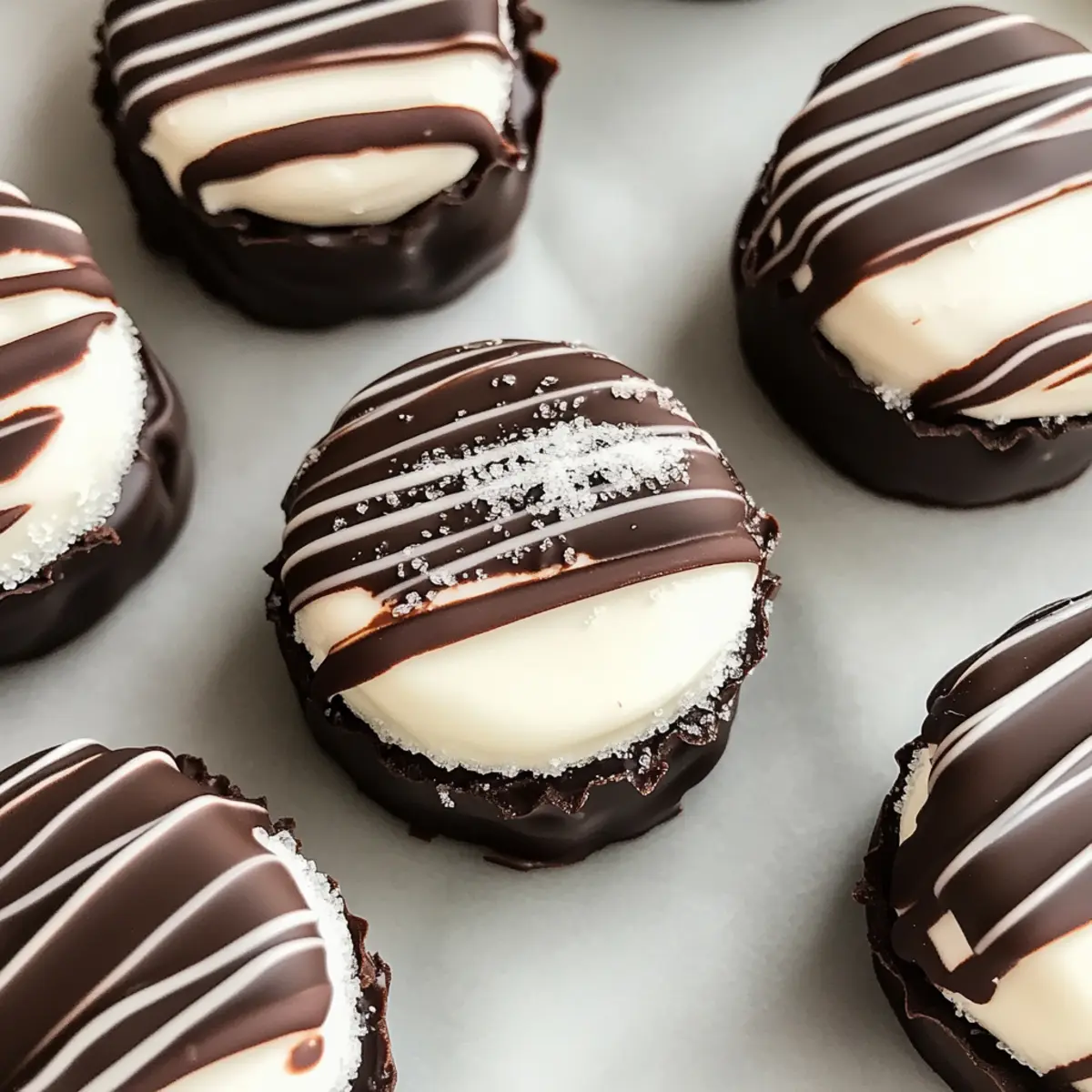 - Fülle die geschmolzene Schokolade in einen Spritzbeutel und trage die Schokolade in einem Zickzackmuster über die Pfefferminzrunden auf.