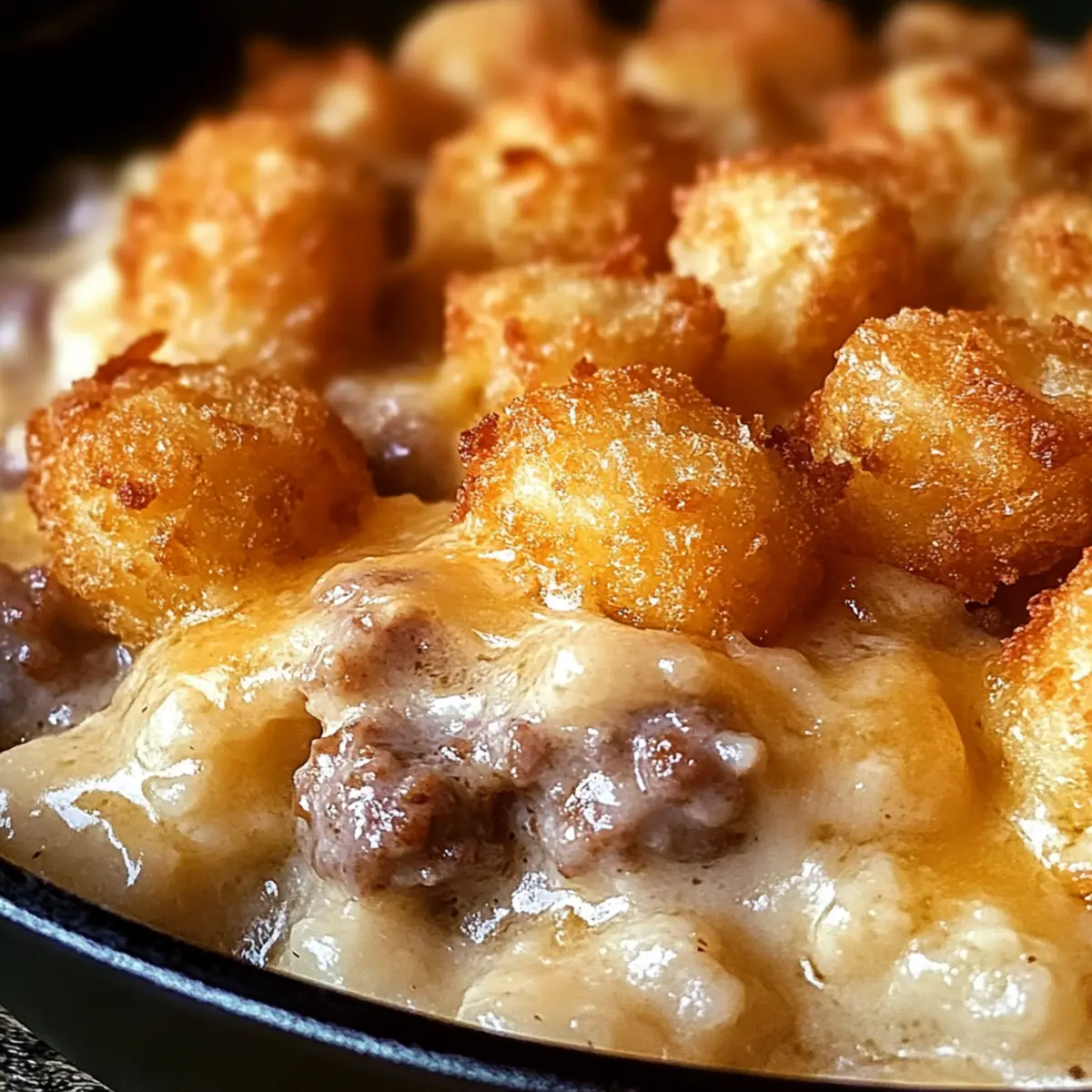 Cremiger Genuss: Die Kombination aus Wurstsoße und knusprigen Tater Tots sorgt für ein Geschmackserlebnis, das keiner im Familienkreis vergessen wird.